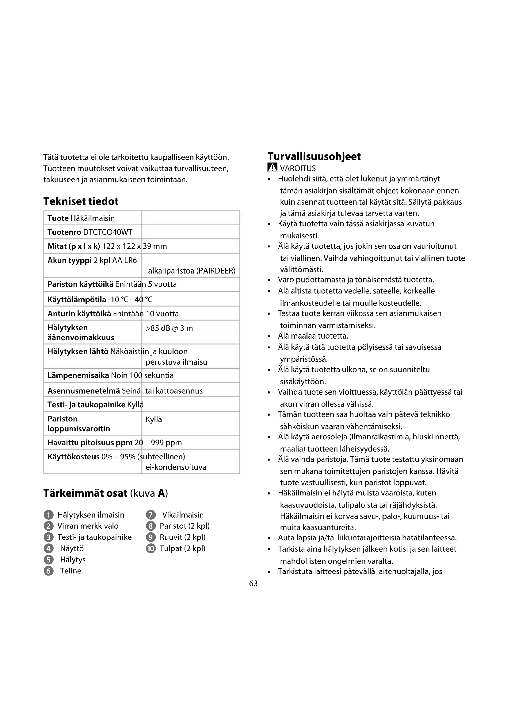 Tuote on suunniteltu suojaamaan käyttäjiä häkämyrkytyksen välittömiltä vaikutuksilta. Tuote ei takaa täyttä suojaa henkilöille, joilla on sairauksia. Paristojen asentaminen (kuva B)