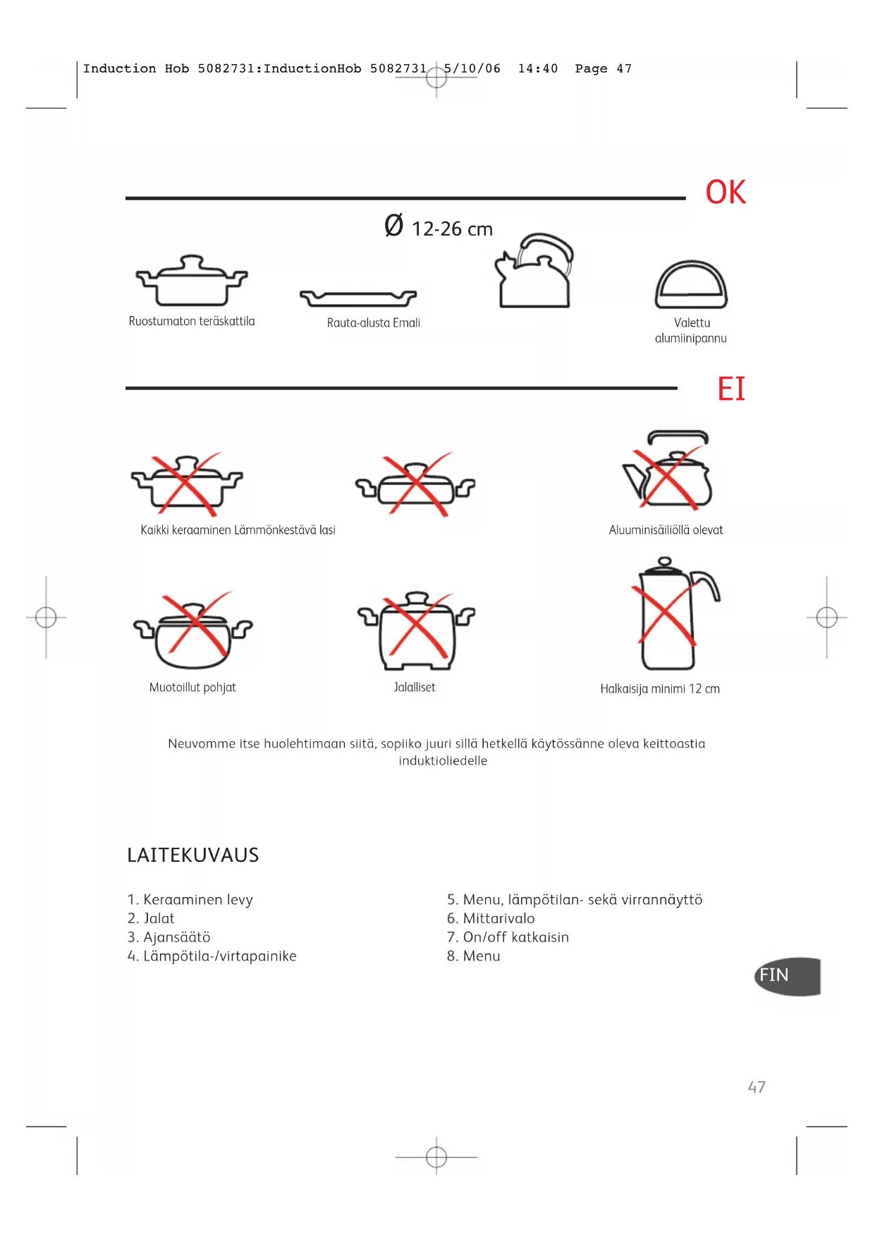 - Kaikki toimenpiteet tulee teettää vain valtuutetussa huoltokeskuksessa käyttäen alkuperäisiä varaosia. Huolehtikaamme ympäristöstä! Laitteesi on varustettu monilla arvokkailla ja kierrätettävillä materiaaleilla. Toimita laitteesi keräyspisteeseen tai sellaisen puuttuessa vaikka valtuutettuun huoltokeskukseen, jotta laitteen osat varmasti kierrätetään. Induction Hob 5082731:InductionHob 5082731 5/10/06 14:40 Page 5051