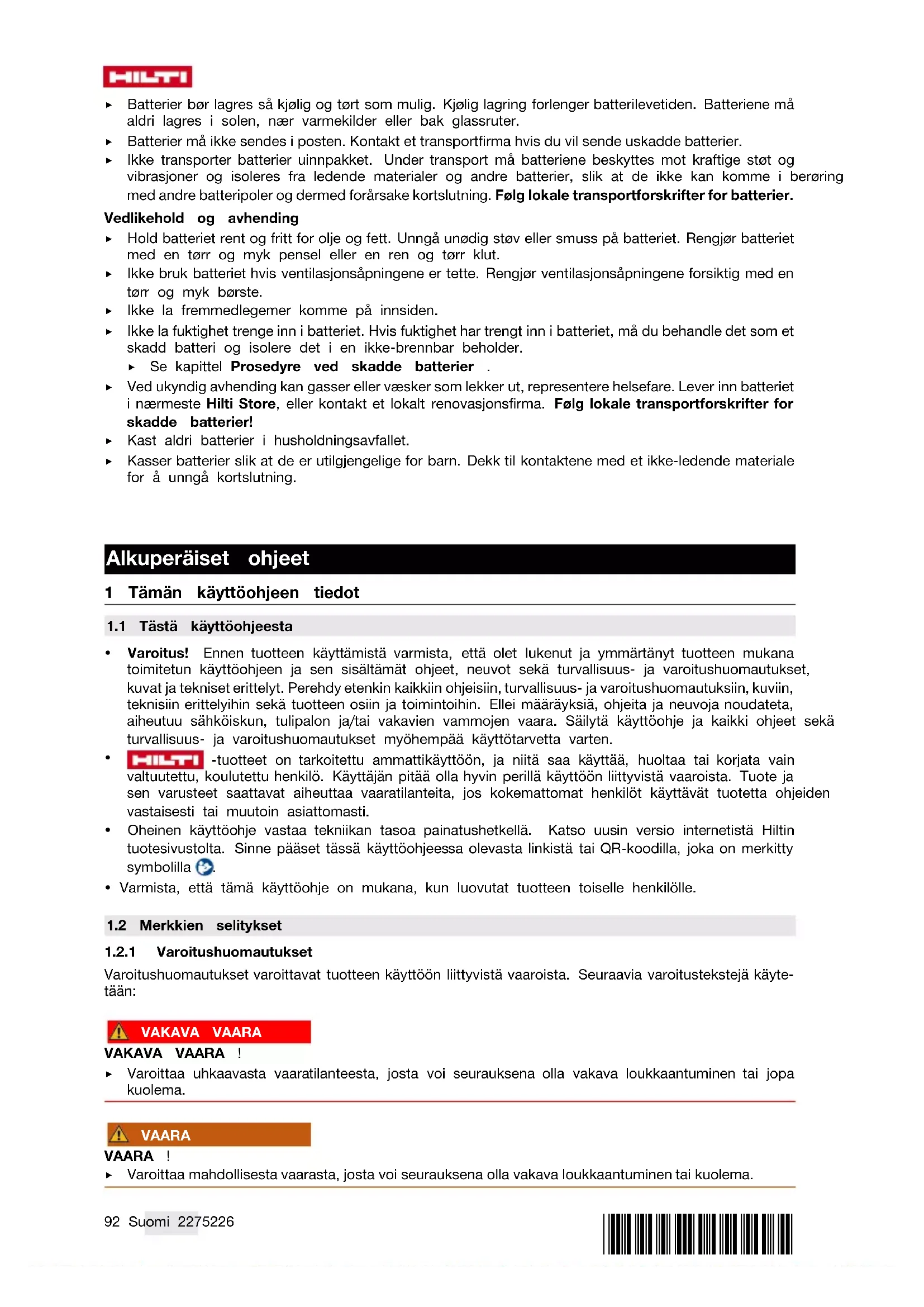 ei-haluttuun toimintaan. 11 Valmistajan myöntämä takuu ▶ Jos sinulla on takuuehtoihin liittyviä kysymyksiä, ota yhteys paikalliseen Hilti-edustajaan. 12 Lisätietoja 13 Hilti-litiumioniakut Turvallisuuteen ja käyttöön liittyviä ohjeita Tässä dokumentaatiossa käytetty käsite "akku" tarkoittaa ladattavia Hiltin litiumioniakkuja, jotka koostuvat useista litiumionikennoista. Ne on tarkoitettu Hilti-sähkötyökaluihin ja niitä saa käyttää vain näissä. Käytä vain alkuperäisiä Hilti-akkuja! Kuvaus Hilti-akuissa on akkukennojen hallinta- ja suojajärjestelmät. Akut on valmistettu kennoista, jotka sisältävät litiumioni-varaajamateriaaleja. Ne mahdollistavat erittäin suuren ominaisenergiatiheyden. Litiumionikennoilla on erittäin vähäinen lataustason muistamisilmiö, mutta sitä vastoin ne reagoivat erittäin herkästi voimankäyttöön, syväpurkaantumiseen ja korkeisiin lämpötiloihin. Hilti-akuille hyväksytyt tuotteet löydät Hilti Store -liikkeestä tai internetosoitteesta www.hilti.group Turvallisuus ▶ Noudata seuraavia turvallisuusohjeita, jotka varmistavat litiumioniakkujen turvallisen käsittelyn ja käytön. Ohjeiden noudattamatta jättäminen saattaa aiheuttaa ihoärsytystä, vakavia syöpymisvammoja, kemiallisia palovammoja, tulipalon ja/tai räjähdyksen. ▶ Käsittele akkuja huolellisesti, jotta vältät vauriot ja terveydelle vakavasti vaarallisten nesteiden vuotamisen ulos! ▶ Akkuja ei saa mitenkään muuttaa tai manipuloida! ▶ Akkuja ei saa avata, puristaa, kuumentaa yli 80 °C:n lämpötilaan tai polttaa. ▶ Älä käytä tai lataa akkua, johon on kohdistunut isku tai joka muutoin on vaurioitunut. Tarkasta akustasi vaurioiden merkit säännöllisin välein. ▶ Älä koskaan käytä kierrätettyä tai korjattua akkua. ▶ Älä käytä akkua tai akkukäyttöistä sähkötyökalua koskaan lyöntityökaluna. ▶ Älä koskaan altista akkua suoralle auringonpaisteelle, korkealle lämpötilalle, kipinöille tai avotulelle. Siitä voi aiheutua räjähdys. ▶ Älä kosketa akun napoja sormilla, työkaluilla, koruilla tai muilla metallisilla esineillä. Seurauksena akku voi vaurioitua ja aiheuttaa aineellisia vahinkoja tai vammoja. ▶ Älä altista akkua sateelle, kosteudelle tai nesteille. Sisään tunkeutunut kosteus voi aiheuttaa oikosulun, sähköiskun, palovammoja tai räjähdyksen.100 Suomi 2275226 *2275226* ▶ Käytä aina vain tälle akkutyypille tarkoitettuja latureita ja sähkötyökaluja. Noudata niiden käyttöohjeissa annettuja ohjeita. ▶ Älä käytä tai varastoi akkua räjähdysvaarallisessa ympäristössä. ▶ Jos akku on liian kuuma koskea, se saattaa olla vaurioitunut. Laita akku palovaarattomaan paikkaan ja riittävän etäälle syttyvistä materiaaleista. Anna akun jäähtyä. Jos akku vielä tunnin kuluttuakin on liian kuuma koskea, akku on vaurioitunut. Toimi kappaleessa Toimenpiteet akkupalossa annettujen ohjeiden mukaisesti. Toiminta jos akku vaurioitunut ▶ Ota yhteys aina Hilti-huoltoon, jos akku on vaurioitunut. ▶ Älä käytä akkua, jos siitä vuotaa ulos nestettä. ▶ Vältä ulos vuotavan nesteen joutumista silmiin ja/tai iholle. Käytä akkunesteen käsittelyssä aina suojakäsineitä ja silmäsuojaimia. ▶ Poista ulosvuotanut akkuneste tarkoitukseen hyväksyttyä kemiallista puhdistusainetta käyttäen. Noudata maakohtaisia akkunesteen puhdistamisesta annettuja ohjeita ja määräyksiä. ▶ Aseta vaurioitunut akku palamattomaan säiliöön ja peitä se kuivalla hiekalla, liitujauheella (CaCO3) tai silikaatilla (vermikuliitti). Sulje säiliön kansi ilmatiiviisti ja säilytä säiliö kaukana syttyvistä kaasuista, nesteistä tai esineistä. ▶ Hävitä säiliö viemällä se Hilti Store -liikkeeseen tai käänny vastuullisen jätteenkäsittely-yrityksen puoleen. Noudata vaurioituneiden akkujen maakohtaisia kuljetusmääräyksiä! Toiminta jos akku ei enää toimi ▶ Tarkkaile, esiintyykö akun epänormaalia käyttäytymistä, esimerkiksi virheellistä latautumista tai poikkeuk- sellisen pitkiä latausaikoja, tuntuvaa tehon heikkenemistä, epänormaalia LED-merkkivalojen toimintaa tai nestevuotoa. Nämä ovat merkki sisäisestä ongelmasta. ▶ Jos epäilet akun sisäistä ongelmaa, ota yhteys Hilti-huoltoon. ▶ Jos akku ei enää toimi tai jos sitä ei voi enää ladata tai siitä vuotaa ulos nestettä, akku on hävitettävä. Ks. kappale Huolto ja hävittäminen. Toimenpiteet akkupalossa VAARA Akkupalon aiheuttama vaara! Palavasta akusta vapautuu ympäristöön vaarallisia ja räjähdysvaarallisia nesteitä ja höyryjä, jotka voivat aiheuttaa syöpymisvammoja, palovammoja tai räjähdyksiä. ▶ Käytä henkilökohtaisia suojavarusteita, jos joudut sammuttamaan akkupaloa. ▶ Varmista riittävä tuuletus, jotta vaaralliset ja räjähdysvaaralliset höyryt pääsevät poistumaan tilasta. ▶ Jos savun muodostus on runsasta, poistu tilasta heti. ▶ Jos hengitysteissä tuntuu ärsytystä, on syytä mennä lääkäriin. ▶ Hälytä palokunta ennen kuin aloitat sammutusyrityksen. ▶ Sammuta akkupalot pelkällä vedellä mahdollisimman etäältä suihkuttaen. Jauhesammuttimet tai sam- mutuspeitot eivät tehoa litiumioniakkujen paloihin. Akkujen ympäristön tulipalo sammutetaan tavallisilla sammutusaineilla. ▶ Älä yritä siirtää suurta määrää palavia akkuja. Siirrä säästyneet materiaalit kauemmas ja siten eristä kyseiset akut. Jos akku ei jäähdy, savuttaa tai palaa: ▶ Ota se lapioon ja heitä se ämpäriin, jossa on vettä. Veden jäähdyttävän vaikutuksen ansiosta palon leviäminen niihin akun kennoihin estyy, joissa lämpötila ei ole vielä noussut syttymisen kannalta kriittisen korkeaksi. ▶ Anna akun olla ämpärissä ainakin 24 tunnin ajan, kunnes akku on kokonaan jäähtynyt. ▶ Ks. kappale Toiminta jos akku vaurioitunut. Tietoa kuljetuksesta ja varastoinnista ▶ Ympäristön lämpötila välillä -17 °C ja +60 °C / 1 °F ja 140 °F. ▶ Varastointilämpötila väli