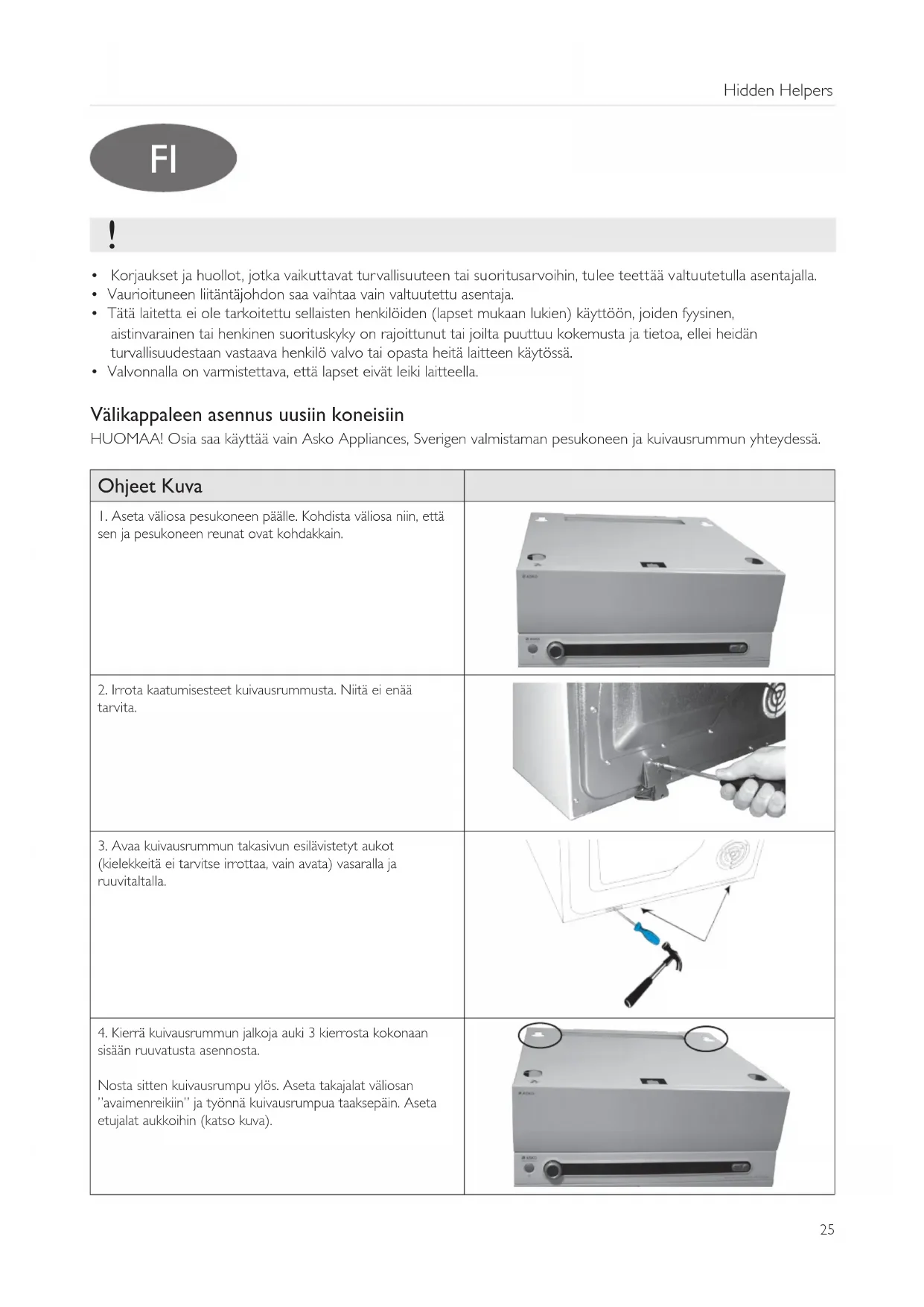 - Valvonnalla on varmistettava, että lapset eivät leiki laitteella. Välikappaleen asennus uusiin koneisiin HUOMAA! Osia saa käyttää vain Asko Appliances, Sverigen valmistaman pesukoneen ja kuivausrummun yhteydessä. Ohjeet Kuva 1. Aseta väliosa pesukoneen päälle. Kohdista väliosa niin, että sen ja pesukoneen reunat ovat kohdakkain.2. Irrota kaatumisesteet kuivausrummusta. Niitä ei enää tarvita.3. Avaa kuivausrummun takasivun esilävistetyt aukot (kielekkeitä ei tarvitse irrottaa, vain avata) vasaralla ja ruuvitaltalla.