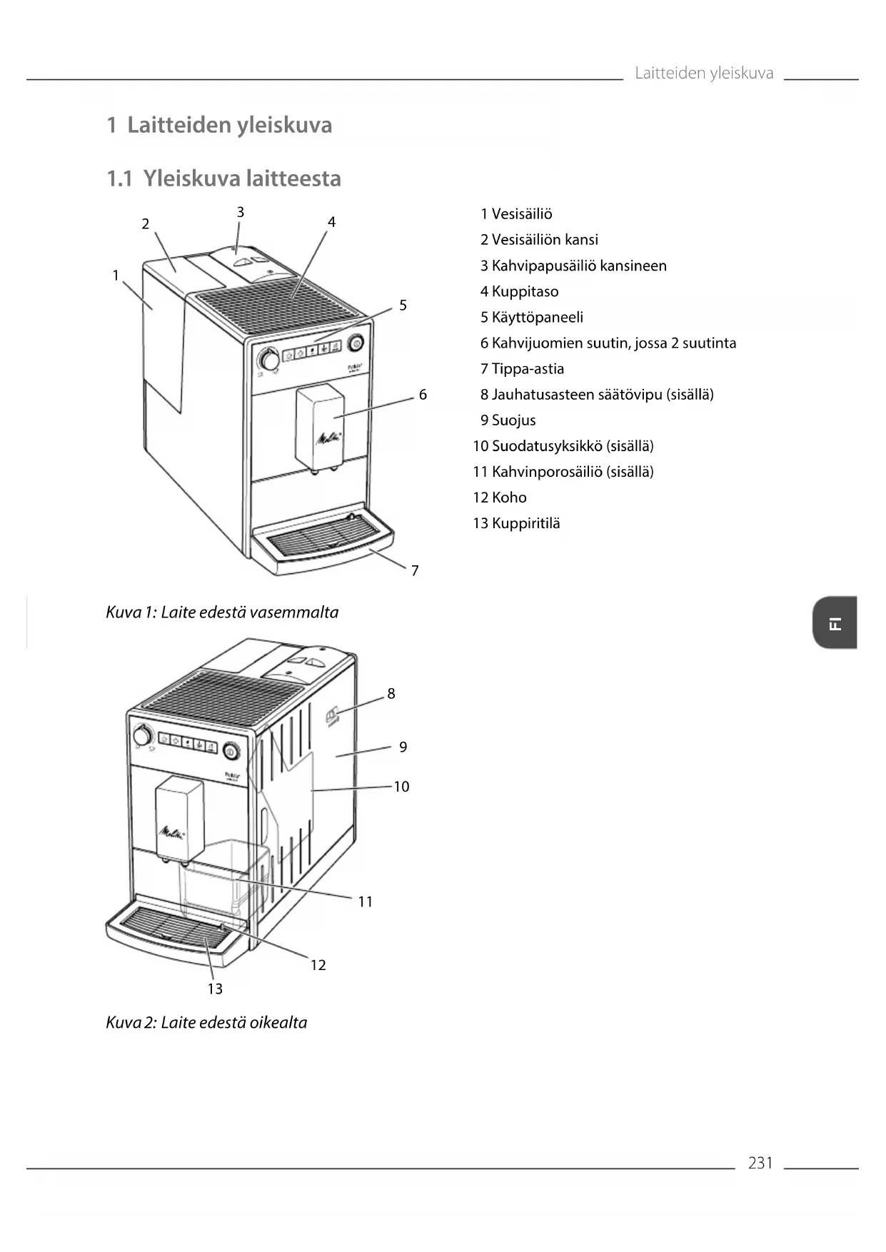 Kuva 2: Laite edestä oikealta 1 Vesisäiliö 2 Vesisäiliön kansi 3 Kahvipapusäiliö kansineen 4 Kuppitaso 5 Käyttöpaneeli 6 Kahvijuomien suutin, jossa 2 suutinta 7 Tippa-astia 8 Jauhatusasteen säätövipu (sisällä) 9 Suojus 10 Suodatusyksikkö (sisällä) 11 Kahvinporosäiliö (sisällä) 12 Koho 13 KuppiritiläLaitteiden yleiskuva