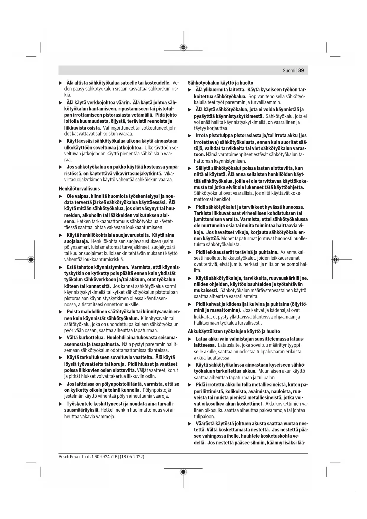 Sagemarkeringen 0° (12) viser posisjonen til sagbladet ved kutt med rett vinkel. Sagemarkeringen 45° (13) viser posisjonen til sagbladet ved 45°-kutt. For at kuttet skal bli nøyaktig, setter du sirkelsagen inntil emnet som vist på bildet. Det lønner seg å foreta et prøvekutt først. Igangsetting Innsetting av batteriet Skyv det ladede batteriet (3) inn i elektroverktøyet til batteriet er sikkert låst. Inn-/utkobling For å bruke elektroverktøyet trykker du på innkoblingssperren (1), og deretter trykker du på av/på- bryteren (2) og holder den inne. For å slå av elektroverktøyet slipper du av/på-bryteren (2). Merknad: Av sikkerhetsgrunner kan ikke av/på-bryteren (2) låses, men må holdes kontinuerlig inne under drift. Beskyttelse mot dyputlading Li-ion-batteriet har ECP, Electronic Cell Protection, som beskytter mot dyputladning. Når batteriet er utladet, kobles elektroverktøyet ut med en beskyttelseskobling: Innsatsverktøyet beveger seg ikke lenger. Arbeidshenvisninger u Ta alltid batteriet ut av elektroverktøyet før arbeider på elektroverktøyet utføres (f.eks. vedlikehold, verktøyskifte osv.) og før transport og oppbevaring. Det er fare for skader hvis du trykker på av/på-bryteren ved en feiltagelse. Snittbredden varierer avhengig av sagbladet som brukes. Beskytt sagbladene mot støt og slag. Før elektroverktøyet jevnt med lett trykk forover i sageretningen. Hvis du trykker det for hardt forover, reduseres levetiden til innsatsverktøyet betraktelig, og elektroverktøyet kan skades. Kuttekapasiteten og -kvaliteten avhenger i stor grad av tilstanden til og formen på tennene til sagbladet. Bruk derfor bare skarpe sagblad som er egnet for det aktuelle materialet. Saging av tre Hvilket sagblad som egner seg, avhenger av treslaget, trekvaliteten og av om du skal sage langsgående eller tverrgående kutt. Ved langsgående saging av gran oppstår det lange, spiralformede spon. Støv fra bøk og eik er spesielt helseskadelig, og du må derfor alltid bruke støvavsug ved saging av disse treslagene. Saging med parallellanlegg (se bildeD) Parallellanlegget (10) gjør det mulig å sage nøyaktig langs kanten på et emne eller sage like stykker. Skyv føringsstangen til parallellanlegget (10) inn på grunnplaten (8) gjennom føringen. Fest parallellanlegget (10) med vingeskruen (15). Saging med begrensningshjelp (se bilde E) Ved bearbeiding av store emner eller kutting av rette kanter kan du bruke en planke eller list som begrensningshjelp på emnet og føre sirkelsagen med grunnplaten langs begrensningshjelpen. Regler for optimal bruk av oppladbare batterier Beskytt batteriet mot fuktighet og vann. Batteriet må oppbevares ved temperatur fra −20°C til 50°C. Du må for eksempel ikke la det ligge i bilen om sommeren. Rengjør ventilasjonsslissene på batteriet regelmessig med en myk, ren og tørr pensel. En vesentlig kortere driftstid etter oppladingen er et tegn på at batteriet er oppbrukt og må skiftes ut. Følg anvisningene om kassering. Service og vedlikehold Vedlikehold og rengjøring u Ta alltid batteriet ut av elektroverktøyet før arbeider på elektroverktøyet utføres (f.eks. vedlikehold, verktøyskifte osv.) og før transport og oppbevaring. Det er fare for skader hvis du trykker på av/på-bryteren ved en feiltagelse. Bosch Power Tools 1 609 92A 7TB | (18.05.2022)88 | Suomi u Hold selve elektroverktøyet og ventilasjonsslissene alltid rene, for å kunne arbeide bra og sikkert. Pendelvernedekselet må alltid bevege seg fritt og kunne stenges automatisk. Sørg derfor for at området rundt vernedekselet alltid er rent. Fjern støv og spon med en pensel. Sagblad uten belegg kan beskyttes mot begynnende korrosjon med et tynt lag syrefri olje. Fjern oljen igjen før sagingen, ettersom det ellers vil bli flekker på treverket. Harpiks- eller limrester på sagbladet gir dårligere kuttkvalitet. Rengjør derfor sagbladene umiddelbart etter bruk. Kundeservice og kundeveiledning Kundeservice hjelper deg ved spørsmål om reparasjon og vedlikehold av produktet ditt og reservedelene. Du finner også sprengskisser og informasjon om reservedeler på www.bosch-pt.com Boschs kundeveilederteam hjelper deg gjerne hvis du har spørsmål om våre produkter og tilbehør. Ved alle forespørsler og reservedelsbestillinger må du oppgi det 10‑sifrede produktnummeret som er angitt på produktets typeskilt. Norsk Robert Bosch AS Postboks 350 1402 Ski Tel.: 64 87 89 50 Faks: 64 87 89 55 Du finner adresser til andre verksteder på: www.bosch-pt.com/serviceaddresses Transport De anbefalte li-ion-batteriene underligger kravene for farlig gods. Batteriene kan transporteres på veier av brukeren uten ytterligere krav. Ved forsendelse gjennom tredje personer (f.eks.: lufttransport eller spedisjon) må det oppfylles spesielle krav til emballasje og merking. Du må konsultere en ekspert for farlig gods ved forberedelse av forsendelsen. Send batterier kun hvis huset ikke er skadet. Lim igjen de åpne kontaktene og pakk batteriet slik at det ikke beveger seg i emballasjen. Ta også hensyn til videreførende nasjonale forskrifter. Deponering Elektroverktøy, batterier, tilbehør og emballasje må leveres inn til miljøvennlig gjenvinning. Elektroverktøy og batterier må ikke kastes i vanlig søppel! Bare for land i EU: Ifølge det europeiske direktivet 2012/19/EU om brukt elektrisk og elektronisk utstyr og gjennomføringen av dette i nasjonalt lovverk må elektroverktøy som ikke lenger kan brukes, og ifølge det europeiske direktivet 2006/66/EC må defekte eller brukte oppladbare batterier / engangsbatterier, sorteres og gjenvinnes på en miljøvennlig måte. Ikke-forskriftsmessig håndtering av elektrisk og elektronisk avfall kan føre til miljø- og helseskader på grunn av eventuelle farlige stoffer. (Oppladbare) batterier: Li-ion: Se informasjonen i avsnittet Transport (se „Transport“, Side88). Suomi Turvallisuusohjeet Yleiset sähkötyökalujen turvaohjeet VAROITUS Lue kaik