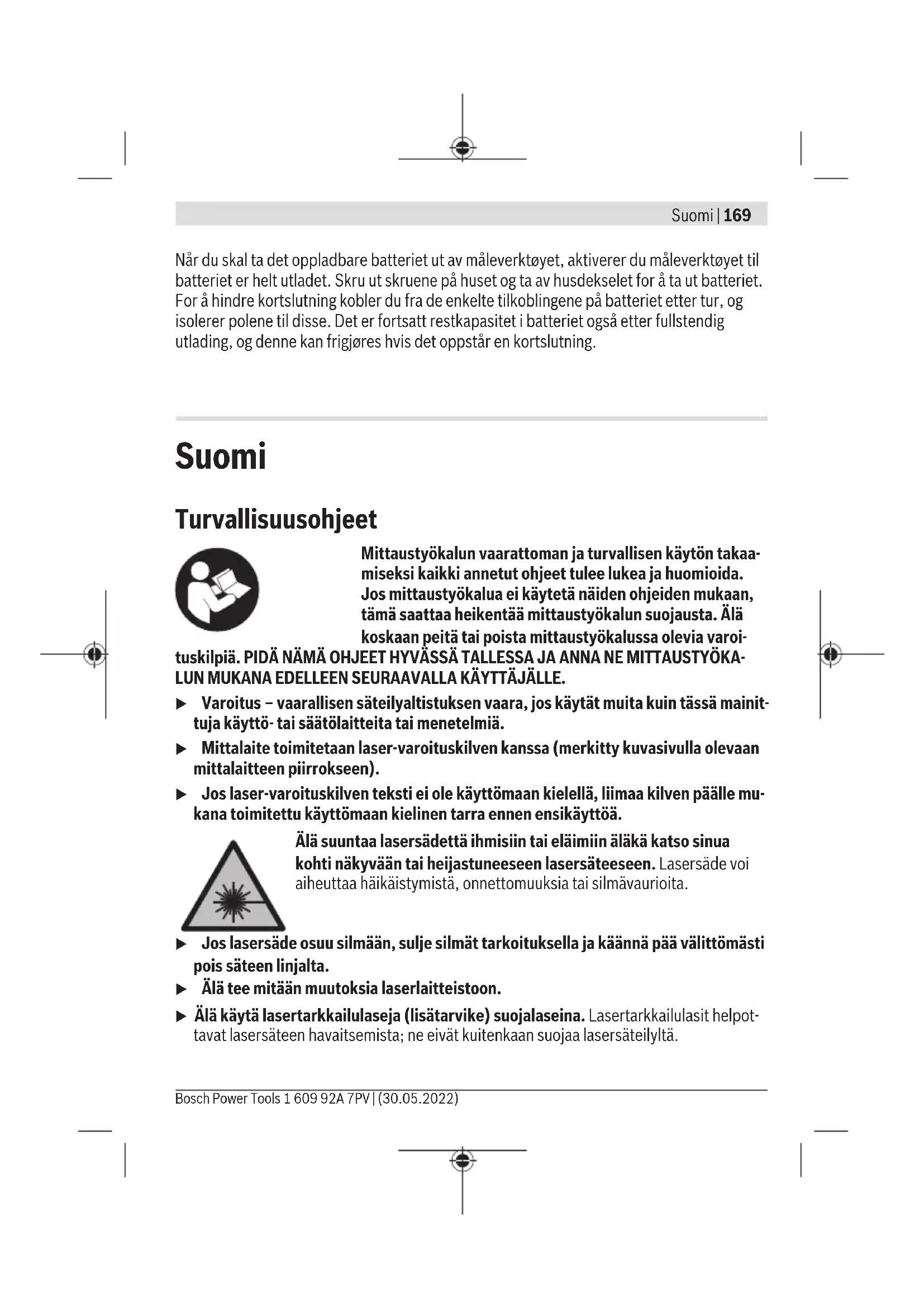 (f) Kontroller at Bluetooth®-grensesnittet er aktivert på denmobile enheten din.Trykk kort på knappen eller hold knappen inntryktfor å åpne menyen Grunnleggende innstillinger .Velg .Trykk på knappen eller knappen for å velge .For å bekrefte valget trykker du på knappen .Bluetooth®-symbolet vises i hvitt på displayet (f). Deaktivering av Bluetooth®-grensesnittet Trykk kort på knappen eller hold knappen inntrykt for å åpne menyenGrunnleggende innstillinger .Velg .Trykk på knappen eller knappen for å velge .For å bekrefte valget trykker du på knappen .Bluetooth®-symbolet vises i grått på displayet . USB-grensesnitt GLM 150-27 C: Dataoverføring via USB-grensesnitt Data kan overføres til bestemte enheter med USB-grensesnitt (for eksempel stasjonæreeller bærbare datamaskiner) via måleverktøyets micro-USB-tilkobling.Koble måleverktøyet til en bærbar eller stasjonær datamaskin ved bruk av micro-USB-kabelen. Operativsystemet på datamaskinen eller den bærbare datamaskinen registrererautomatisk måleverktøyet som stasjon.1 609 92A 7PV | (30.05.2022) Bosch Power ToolsNorsk | 167 Når måleverktøyet er koblet til en datamaskin eller et nettbrett via micro-USB- kabelen, lades li-ion-batteriet opp. Ladetiden varierer avhengig av ladestrømmen. Kontrollere nøyaktigheten Kontroller nøyaktigheten til helningsmålingen og avstandsmålingen jevnlig. Se nettversjonen av bruksanvisningen hvis du ønsker mer informasjon: www.bosch-pt.com/manuals Feilmelding Måleverktøyet overvåker funksjonen ved hver måling. Hvis det konstateres en feil, viser displayet bare symbolet ved siden av, og måleverktøyet slår seg av. I dette tilfellet må måleverktøyet leveres til Bosch kundeservice via forhandleren. Service og vedlikehold Vedlikehold og rengjøring Lagre og transporter måleverktøyet bare i beskyttelsesvesken som fulgte med. Sørg for at måleverktøyet alltid er rent. Måleverktøyet må ikke senkes ned i vann eller andre væsker. Tørk bort skitt med en myk, fuktig klut. Bruk ikke rengjørings- eller løsemidler. Rengjør spesielt mottakslinsen (20), laseråpningen (21) og kameraet (22) svært forsiktig: Pass på at det ikke er noe smuss på mottakslinsen, i laseråpningen og på kameraet. Rengjør mottakslinsen, laseråpningen og kameraet bare med midler som også er egnet til linsene på fotoapparat. Du må ikke forsøke å fjerne skitt på mottakslinsen, laseråpningen eller kameraet med skarpe gjenstander, og ikke tørke av dem (fare for riper). Hvis måleverktøyet skal sendes til reparasjon, sender du det i beskyttelsesvesken(24). Kundeservice og kundeveiledning Kundeservice hjelper deg ved spørsmål om reparasjon og vedlikehold av produktet ditt og reservedelene. Du finner også sprengskisser og informasjon om reservedeler på www.bosch-pt.com Boschs kundeveilederteam hjelper deg gjerne hvis du har spørsmål om våre produkter og tilbehør. Ved alle forespørsler og reservedelsbestillinger må du oppgi det 10‑sifrede produktnummeret som er angitt på produktets typeskilt. Bosch Power Tools 1 609 92A 7PV | (30.05.2022)168 | Norsk Norsk Robert Bosch AS Postboks 350 1402 Ski Tel.: 64 87 89 50 Faks: 64 87 89 55 Du finner adresser til andre verksteder på: www.bosch-pt.com/serviceaddresses Transport Li-ion-batteriene i verktøyet underligger kravene for farlig gods. Batteriene kan transporteres på veier av brukeren uten ytterligere krav. Ved forsendelse gjennom tredje personer (f.eks.: lufttransport eller spedisjon) må det oppfylles spesielle krav til emballasje og merking. Du må konsultere en ekspert for farlig gods ved forberedelse av forsendelsen. Kassering Måleverktøy, ladere, batterier, tilbehør og emballasje skal leveres til et innsamlingssted for gjenvinning. Kast ikke måleverktøy, ladere og batterier i husholdningsavfallet! Bare for land i EU: Ifølge det europeiske direktivet 2012/19/EU om brukt elektrisk og elektronisk utstyr og gjennomføringen av dette i nasjonalt lovverk må måleverktøy og ladere som ikke lenger kan brukes, og ifølge det europeiske direktivet 2006/66/EC må defekte eller brukte oppladbare batterier / engangsbatterier, sorteres og gjenvinnes på en miljøvennlig måte. Ikke-forskriftsmessig håndtering av elektrisk og elektronisk avfall kan føre til miljø- og helseskader på grunn av eventuelle farlige stoffer. Batterier: Li-ion: Les informasjonen i avsnittet Transport (se „Transport“, Side168). u Integrerte oppladbare batterier må bare tas ut og kasseres av fagpersonale. Måleverktøyet kan bli ødelagt hvis husdekselet åpnes. 1 609 92A 7PV | (30.05.2022) Bosch Power ToolsSuomi | 169 Når du skal ta det oppladbare batteriet ut av måleverktøyet, aktiverer du måleverktøyet til batteriet er helt utladet. Skru ut skruene på huset og ta av husdekselet for å ta ut batteriet. For å hindre kortslutning kobler du fra de enkelte tilkoblingene på batteriet etter tur, og isolerer polene til disse. Det er fortsatt restkapasitet i batteriet også etter fullstendig utlading, og denne kan frigjøres hvis det oppstår en kortslutning. Suomi Turvallisuusohjeet Mittaustyökalun vaarattoman ja turvallisen käytön takaa- miseksi kaikki annetut ohjeet tulee lukea ja huomioida. Jos mittaustyökalua ei käytetä näiden ohjeiden mukaan, tämä saattaa heikentää mittaustyökalun suojausta. Älä koskaan peitä tai poista mittaustyökalussa olevia varoi- tuskilpiä. PIDÄ NÄMÄ OHJEET HYVÄSSÄ TALLESSA JA ANNA NE MITTAUSTYÖKA- LUN MUKANA EDELLEEN SEURAAVALLA KÄYTTÄJÄLLE. u Varoitus – vaarallisen säteilyaltistuksen vaara, jos käytät muita kuin tässä mainit- tuja käyttö- tai säätölaitteita tai menetelmiä. u Mittalaite toimitetaan laser-varoituskilven kanssa (merkitty kuvasivulla olevaan mittalaitteen piirrokseen). u Jos laser-varoituskilven teksti ei ole käyttömaan kielellä, liimaa kilven päälle mu- kana toimitettu käyttömaan kielinen tarra ennen ensikäyttöä. Älä suuntaa lasersädettä ihmisiin tai 