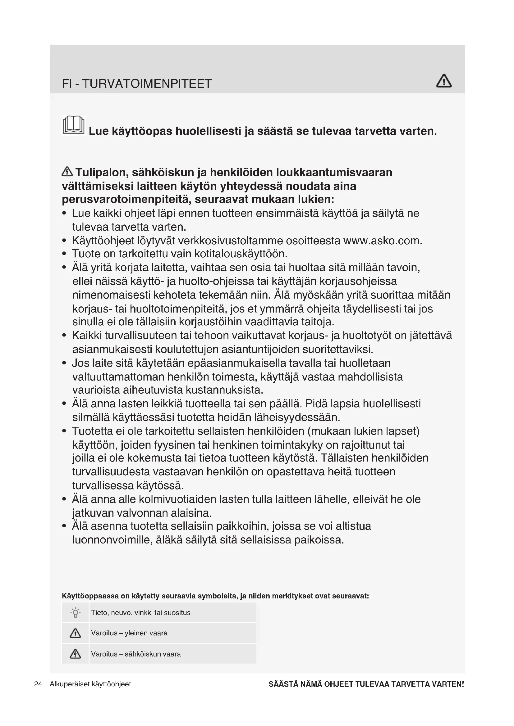 - Älä asenna tuotetta sellaisiin paikkoihin, joissa se voi altistua luonnonvoimille, äläkä säilytä sitä sellaisissa paikoissa. Alkuperäiset käyttöohjeet SÄÄSTÄ NÄMÄ OHJEET TULEVAA TARVETTA VARTEN! Käyttöoppaassa on käytetty seuraavia symboleita, ja niiden merkitykset ovat seuraavat: Tieto, neuvo, vinkki tai suositus Varoitus – yleinen vaara Varoitus – sähköiskun vaara25 Ulosvedettävää aputasoa saa käyttää vain Asko Appliances -yhtiön valmistaman pesukoneen ja kuivausrummun yhteydessä.
