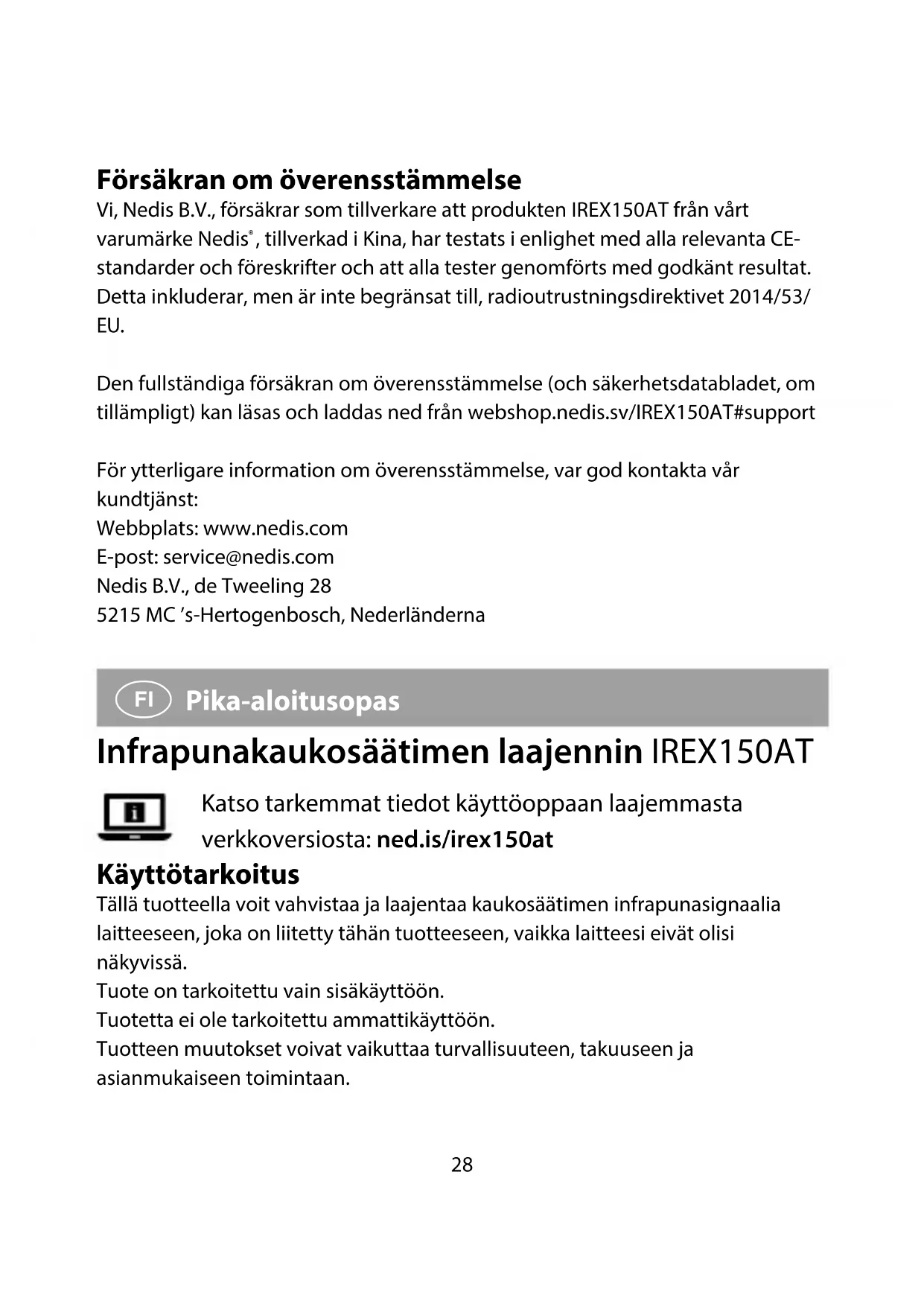 , valmistettu Kiinassa, on testattu kaikkien asiaankuuluvien CE-standardien ja määräysten mukaisesti ja tuote on läpäissyt kaikki testit. Tämä sisältää RED 2014/53/EU -direktiivin siihen kuitenkaan rajoittumatta. Täydellinen vaatimustenmukaisuusvakuutus (ja käyttöturvallisuustiedote, mikäli käytettävissä) on saatavilla ja ladattavissa osoitteesta webshop.nedis./ IREX150AT#support Lisätietoa vaatimustenmukaisuudesta saat ottamalla yhteyttä asiakaspalveluun: Internet: www.nedis.com Sähköposti: service@nedis.com Nedis B.V., de Tweeling 28 5215 MC ’s-Hertogenbosch, Alankomaat