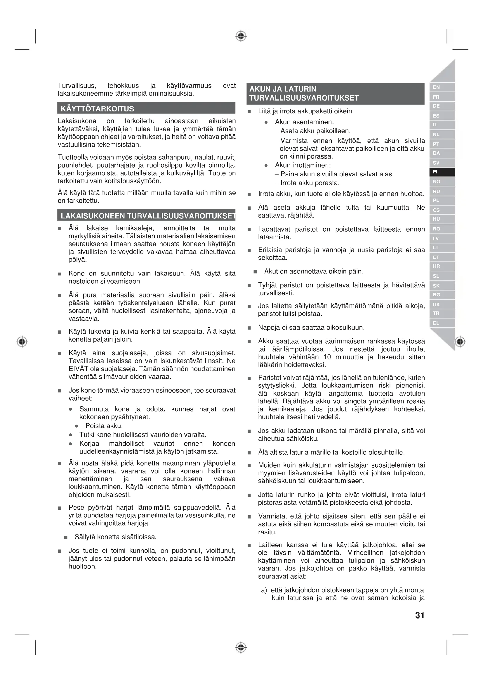 Lakaisukone on tarkoitettu ainoastaan aikuisten käytettäväksi, käyttäjien tulee lukea ja ymmärtää tämän käyttöoppaan ohjeet ja varoitukset, ja heitä on voitava pitää vastuullisina tekemisistään. Tuotteella voidaan myös poistaa sahanpuru, naulat, ruuvit, puunlehdet, puutarhajäte ja ruohosilppu kovilta pinnoilta, kuten korjaamoista, autotalleista ja kulkuväyliltä. Tuote on tarkoitettu vain kotitalouskäyttöön. Älä käytä tätä tuotetta millään muulla tavalla kuin mihin se on tarkoitettu. LAKAISUKONEEN TURVALLISUUSVAROITUKSET Ŷ Älä lakaise kemikaaleja, lannoitteita tai muita myrkyllisiä aineita. Tällaisten materiaalien lakaisemisen seurauksena ilmaan saattaa nousta koneen käyttäjän ja sivullisten terveydelle vakavaa haittaa aiheuttavaa pölyä. Ŷ Kone on suunniteltu vain lakaisuun. Älä käytä sitä nesteiden siivoamiseen. Ŷ Älä pura materiaalia suoraan sivullisiin päin, äläkä päästä ketään työskentelyalueen lähelle. Kun purat soraan, vältä huolellisesti lasirakenteita, ajoneuvoja ja vastaavia. Ŷ Käytä tukevia ja kuivia kenkiä tai saappaita. Älä käytä konetta paljain jaloin. Ŷ Käytä aina suojalaseja, joissa on sivusuojaimet. Tavallisissa laseissa on vain iskunkestävät linssit. Ne EIVÄT ole suojalaseja. Tämän säännön noudattaminen vähentää silmävaurioiden vaaraa. Ŷ Jos kone törmää vieraaseen esineeseen, tee seuraavat vaiheet: Ɣ Sammuta kone ja odota, kunnes harjat ovat kokonaan pysähtyneet. Ɣ Poista akku. Ɣ Tutki kone huolellisesti vaurioiden varalta. Ɣ Korjaa mahdolliset vauriot ennen koneen uudelleenkäynnistämistä ja käytön jatkamista. Ŷ Älä nosta äläkä pidä konetta maanpinnan yläpuolella käytön aikana, vaarana voi olla koneen hallinnan menettäminen ja sen seurauksena vakava loukkaantuminen. Käytä konetta tämän käyttöoppaan ohjeiden mukaisesti. Ŷ Pese pyörivät harjat lämpimällä saippuavedellä. Älä yritä puhdistaa harjoja paineilmalla tai vesisuihkulla, ne voivat vahingoittaa harjoja. Ŷ Säilytä konetta sisätiloissa. Ŷ Jos tuote ei toimi kunnolla, on pudonnut, vioittunut, jäänyt ulos tai pudonnut veteen, palauta se lähimpään huoltoon.