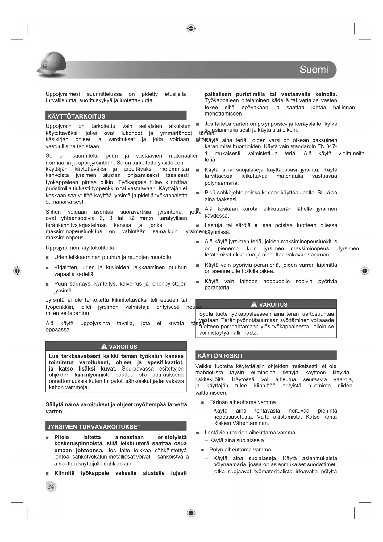 vapaalla kädellä. Ŷ 3XXQ VlUPl\V N\QWHLW\V NDLYHUUXV MD ORKHQS\UVW|MHQ M\UVLQWl Jyrsintä ei ole tarkoitettu kiinnitettäväksi telineeseen tai W\|SHQNNLLQ HOOHL M\UVLPHQ YDOPLVWDMD HULW\LVHVWL QHXYR miten se tapahtuu. bOl Nl\Wl XSSRM\UVLQWl WDYDOOD MRWD HL NXYDWD WlVVl oppaassa. VAROITUS Lue tarkkaavaisesti kaikki tämän työkalun kanssa toimitetut varoitukset, ohjeet ja spesifikaatiot, ja katso lisäksi kuvat. 6HXUDDYDVVD HVLWHWW\MHQ RKMHLGHQ ODLPLQO\|QQLVWl VDDWWDD ROOD VHXUDXNVHQD RQQHWWRPXXNVLDNXWHQWXOLSDORWVlKN|LVNXWMDWDLYDNDYLD NHKRQYDPPRMD Säilytä nämä varoitukset ja ohjeet myöhempää tarvetta varten. JYRSIMEN TURVAVAROITUKSET Ŷ Pitele laitetta ainoastaan eristetyistä kosketuspinnoista, sillä leikkuuterä saattaa osua omaan johtoonsa. Jos laite leikkaa sähköistettyä MRKWRDVlKN|W\|NDOXQPHWDOOLRVDWYRLYDW VlKN|LVW\lMD DLKHXWWDDNl\WWlMlOOHVlKN|LVNXQ Ŷ Kiinnitä työkappale vakaalle alustalle lujasti paikalleen puristimilla tai vastaavalla keinolla. Työkappaleen piteleminen kädellä tai vartaloa vasten WHNHH VLLWl HSlYDNDDQ MD VDDWWDD MRKWDD KDOOLQQDQ menettämiseen. Ŷ -RVODLWHWWDYDUWHQRQS|O\QSRLVWRMDNHUl\VODLWHN\WNH VHDVLDQPXNDLVHVWLMDNl\WlVLWlRLNHLQ Ŷ .l\Wl DLQD WHULl MRLGHQ YDUVL RQ RLNHDQ SDNVXLQHQ karan mitat huomioiden. Käytä vain standardin EN 847- PXNDLVHVWL YDOPLVWHWWXMD WHULl bOl Nl\Wl YLRLWWXQHLWD teriä. Ŷ .l\Wl DLQD VXRMDODVHMD Nl\WWlHVVlVL M\UVLQWl .l\Wl tarvittaessa leikattavaa materiaalia vastaavaa pölynaamaria. Ŷ 3LGlVlKN|MRKWRSRLVVDNRQHHQNl\WW|DOXHHOWD6LLUUlVH aina taaksesi. Ŷ bOl NRVNDDQ NXURWD OHLNNXXWHUlQ OlKHOOH M\UVLPHQ käydessä. Ŷ /DVWXMD WDL VlU|Ml HL VDD SRLVWDD WXRWWHHQ ROOHVVD käynnissä. Ŷ bOlNl\WlM\UVLPHQWHULlMRLGHQPDNVLPLQRSHXVOXRNLWXV RQ SLHQHPSL NXLQ M\UVLPHQ PDNVLPLQRSHXV -\UVLPHQ WHUlWYRLYDWULNNRXWXDMDDLKHXWWDDYDNDYDQYDPPDQ Ŷ .l\WlYDLQ S\|ULYLlSRUDQWHULlMRLGHQ YDUUHQOlSLPLWWD on asennetulle holkille oikea. Ŷ Käytä vain laitteen nopeudelle sopivia pyöriviä poranteriä. VAROITUS Syötä tuote työkappaleeseen aina terän kiertosuuntaa vastaan. Terän pyörintäsuuntaan syöttäminen voi saada