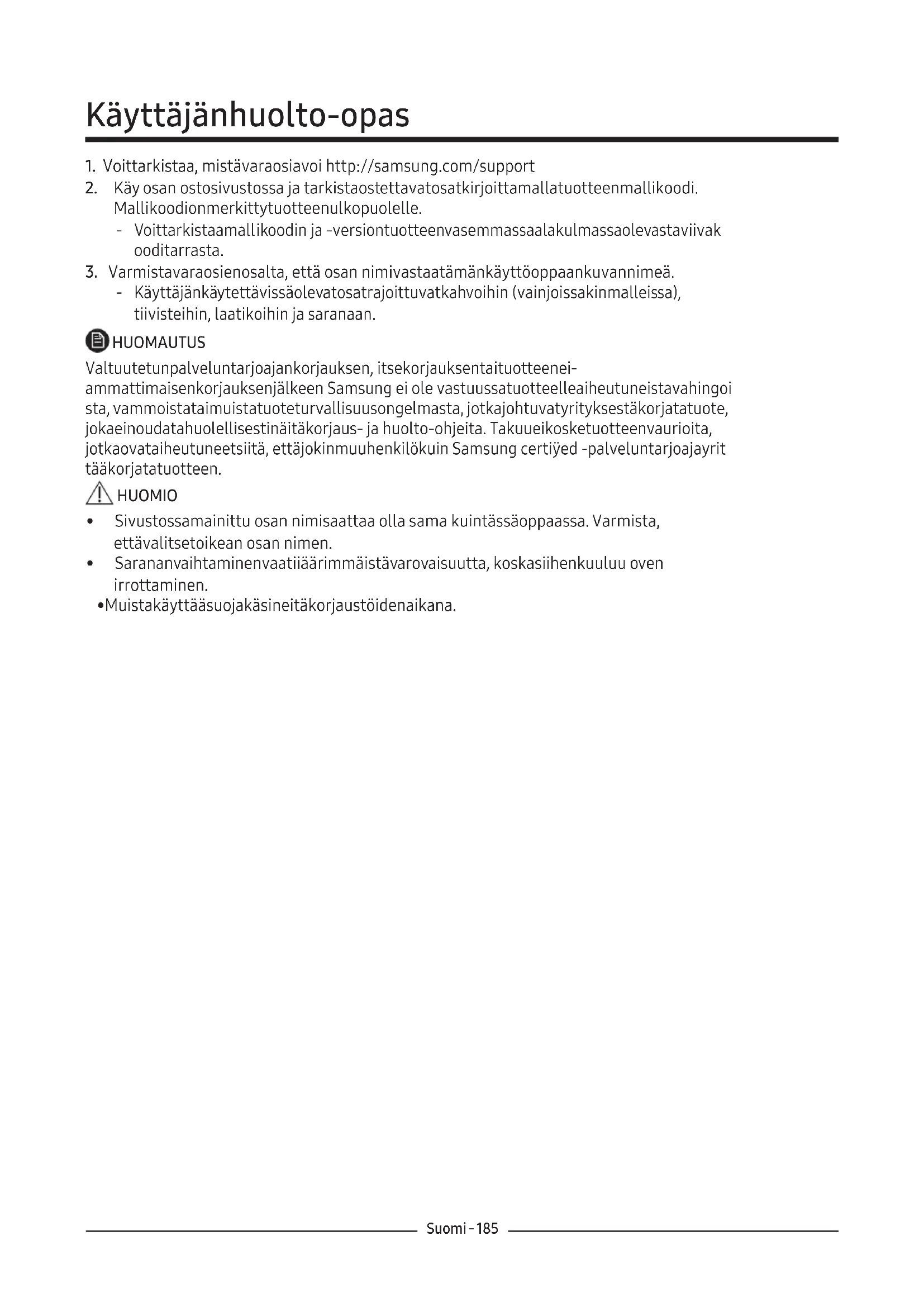‐ Käyttäjänkäytettävissäolevatosatrajoittuvatkahvoihin (vainjoissakinmalleissa), tiivisteihin, laatikoihin ja saranaan. HUOMAUTUS Valtuutetunpalveluntarjoajankorjauksen, itsekorjauksentaituotteenei- ammattimaisenkorjauksenjälkeen Samsung ei ole vastuussatuotteelleaiheutuneistavahingoi sta, vammoistataimuistatuoteturvallisuusongelmasta, jotkajohtuvatyrityksestäkorjatatuote, jokaeinoudatahuolellisestinäitäkorjaus- ja huolto-ohjeita. Takuueikosketuotteenvaurioita, jotkaovataiheutuneetsiitä, ettäjokinmuuhenkilökuin Samsung certiÿed -palveluntarjoajayrit tääkorjatatuotteen. HUOMIO