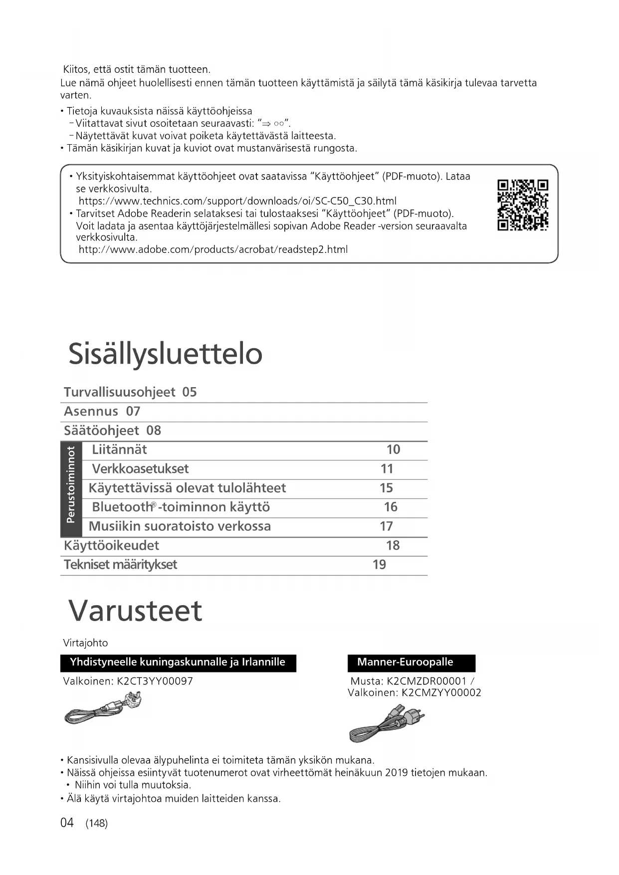 - Yksityiskohtaisemmat käyttöohjeet ovat saatavissa “Käyttöohjeet” (PDF-muoto). Lataa se verkkosivulta. https://www.technics.com/support/downloads/oi/SC-C50_C30.html