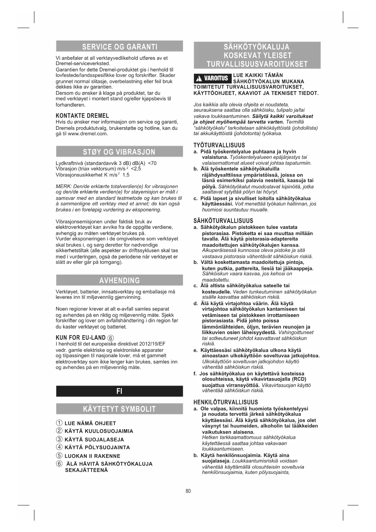 Suosittelemme, että kaikki työkalun huoltotoimenpiteet suoritetaan Dremelin huoltokeskuksessa. Tällä Dremel-tuotteella on lakisääteinen / maakohtaisten säännösten mukainen takuu. Tämä takuu ei kata normaalia kulumista tai ylikuormituksesta tai virheellisestä käsittelystä johtuvia vaurioita. Jos haluat tehdä valituksen, toimita työkalu tai laturi jälleenmyyjälle purkamattomana yhdessä ostokuitin kanssa. DREMELIN YHTEYSTIEDOT Huollosta ja takuusta, muista Dremelin tuotteista, tuesta ja hotline-puhelinpalvelusta löytyy lisätietoa osoitteesta www.dremel.com.
