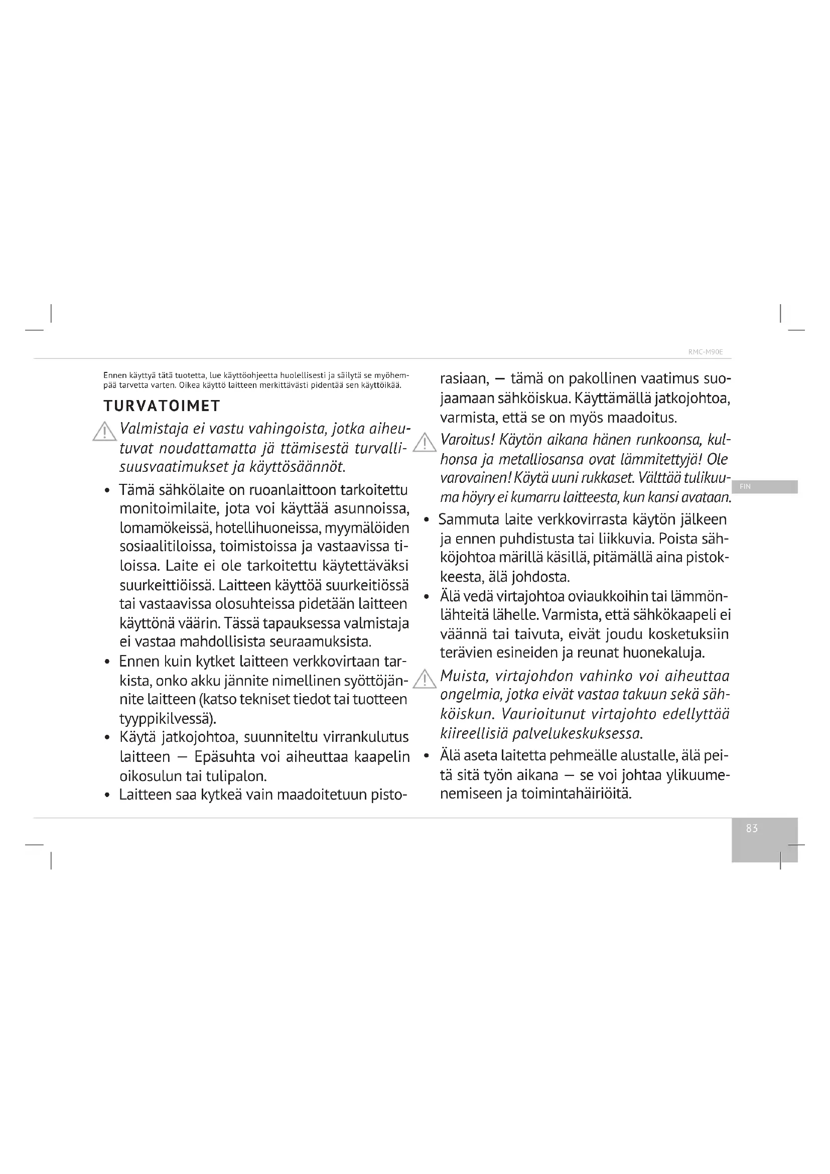 Pura varovasti pakkauksesta tuotteen ja poista se laatikosta, poista kaikki pakkausten ja mainonnan etiketit lukuun ottamatta sarjanumeroa. Sarjanumeron puute automaattisesti päättää sen takuutta.85 RMC-M90E FIN Puhdista laitteen kostealla liinalla. Pese kulho lämpimällä vedellä. Kuivaa huolellisesti. Ensimmäisellä käyttökerralla näyttöön saattaa tulla vieraita hajuja, että ei johdu yksikön toimintahäiriö. Tässä tapauksessa puhdista välineettä. Huomio! Kiellettiin laitteen kayttöä vioista.