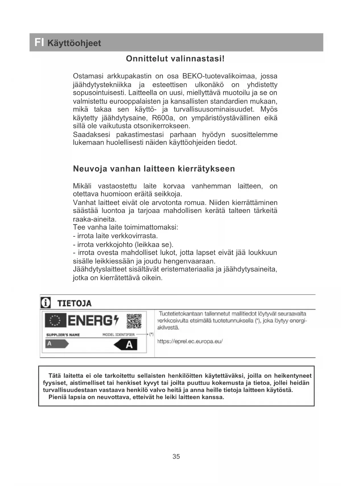 Tätä laitetta ei ole tarkoitettu sellaisten henkilöitten käytettäväksi, joilla on heikentyneet fyysiset, aistimelliset tai henkiset kyvyt tai joilta puuttuu kokemusta ja tietoa, jollei heidän turvallisuudestaan vastaava henkilö valvo heitä ja anna heille tieto ja laitteen käytöstä. Pieniä lapsia on neuvottava, etteivät he leiki laitteen kanssa.Pakkauksen kierrätys VAROITUS! Älä anna lasten leikkiä pakkauksella tai sen osilla. Aaltopahvin tai muovikelmun palasiin voi tukehtua. Jotta saisit laitteen hyvässä kunnossa, se on suojattu soveliaalla pakkausmateriaalilla. Kaikki pakkausmateriaalit ovat yhteensopivia ympäristön kanssa ja kierrätettäviä. Auta meitä kierrättämään pakkausmateriaali ja suojelemaan ympäristöä! TÄRKEÄÄ! Ennen kuin käytät laitetta lue nämä ohjeet huolellisesti ja kokonaisuudessaan. Ne sisältävät tärkeää tietoa laitteen asennuksesta, käytöstä ja huollosta. Valmistaja on vapaa kaikista vastuista, mikäli tämän ohjekirjan neuvoja ei noudateta. Säilytä nämä ohjeet varmassa paikassa, jotta ne ovat tarvittaessa helposti saatavilla. Niistä voi myös olla hyötyä seuraavalle käyttäjälle. HUOMIO! Laitetta saa käyttää ainoastaan käyttötarkoitukseensa (kotitalouskäyttö), sopivassa paikassa suojattuna sateelta, kosteudelta ja muilta sääilmiöiltä. Kuljetusohjeet Laitetta on kuljetettava mahdollisuuksien mukaan ainoastaan pystyasennossa. Pakkauksen on oltava täysin ehjä kuljetuksen aikana. Jos laite asetetaan kuljetuksen aikana vaakatasoon (vain pakkauksen merkintöjen mukaan), suositellaan, että ennen käyttöä laitteen annetaan olla paikoillaan 4 tuntia kuljetuksen jälkeen, jotta jäähdytysvirtapiiri ehtii asettua. Näiden ohjeiden noudattamatta jättäminen voi aiheuttaa kompressorimoottorin rikkoutumisen ja tämän takuun raukeamiseen.