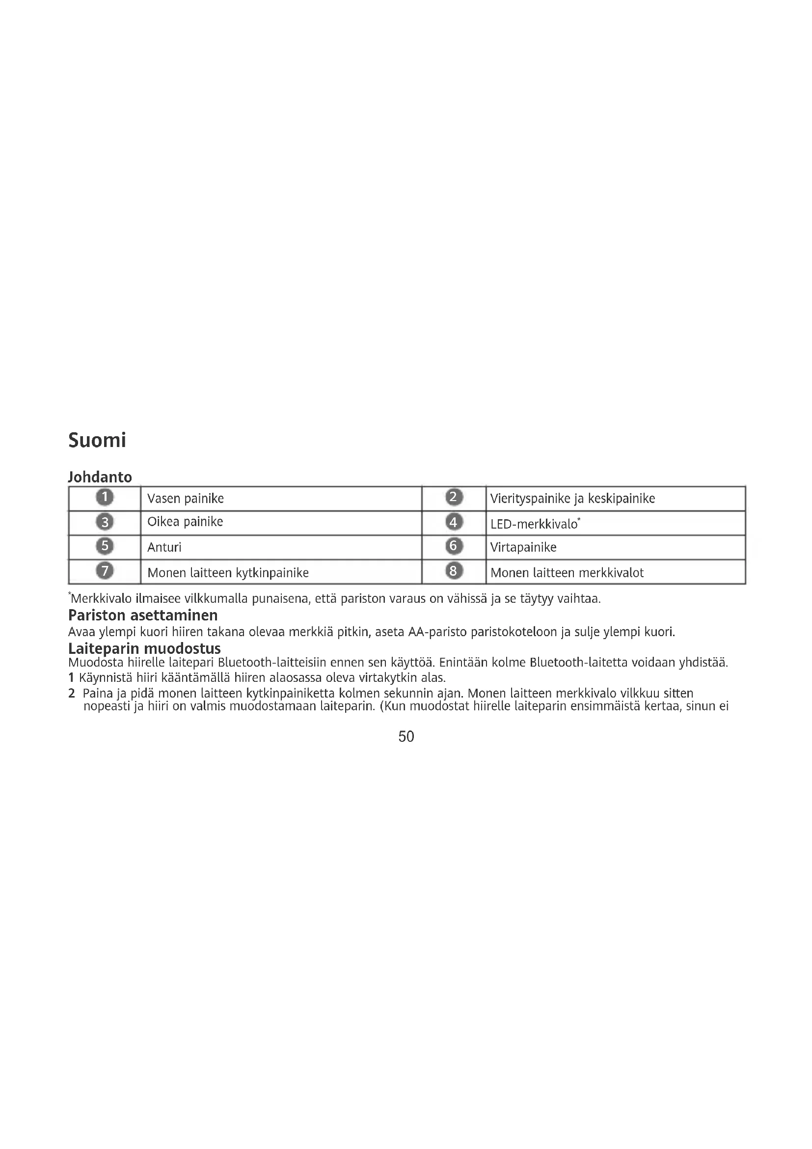 Merkkivalo ilmaisee vilkkumalla punaisena, että pariston varaus on vähissä ja se täytyy vaihtaa. Pariston asettaminen Avaa ylempi kuori hiiren takana olevaa merkkiä pitkin, aseta AA-paristo paristokoteloon ja sulje ylempi kuori. Laiteparin muodostus Muodosta hiirelle laitepari Bluetooth-laitteisiin ennen sen käyttöä. Enintään kolme Bluetooth-laitetta voidaan yhdistää. 1 Käynnistä hiiri kääntämällä hiiren alaosassa oleva virtakytkin alas. 2 Paina ja pidä monen laitteen kytkinpainiketta kolmen sekunnin ajan. Monen laitteen merkkivalo vilkkuu sitten nopeasti ja hiiri on valmis muodostamaan laiteparin. (Kun muodostat hiirelle laiteparin ensimmäistä kertaa, sinun ei 50tarvitse painaa ja pitää monen laitteen kytkinpainiketta. Kun hiiri on kytketty päälle, monen laitteen merkkivalo vilkkuu nopeasti ja hiiri on automaattisesti valmis muodostamaan laiteparin.) 3 Aloita laiteparin muodostaminen Bluetooth-laitteessa, valitse hiiren nimi ja viimeistele laiteparin muodostus noudattamalla näytön ohjeita. 4 Paina monen laitteen kytkinpainiketta, kunnes vastaava monen laitteen merkkivalo syttyy. Paina sitten monen laitteen kytkinpainiketta 3 sekunnin ajan ja muodosta laitepari muiden Bluetooth-laitteiden kanssa suorittamalla edelliset vaiheet. Hiiri tukee vain laitteita, joissa on Windows 10, Windows 8.1, macOS 10.10, iOS 13.1, HarmonyOS 2, Android 5.0 tai uudempi tai Linux. Käyttö Voit vaihtaa useiden Bluetooth-laitteiden välillä painamalla monen laitteen kytkinpainiketta. Turvallisuutta koskevat tiedot