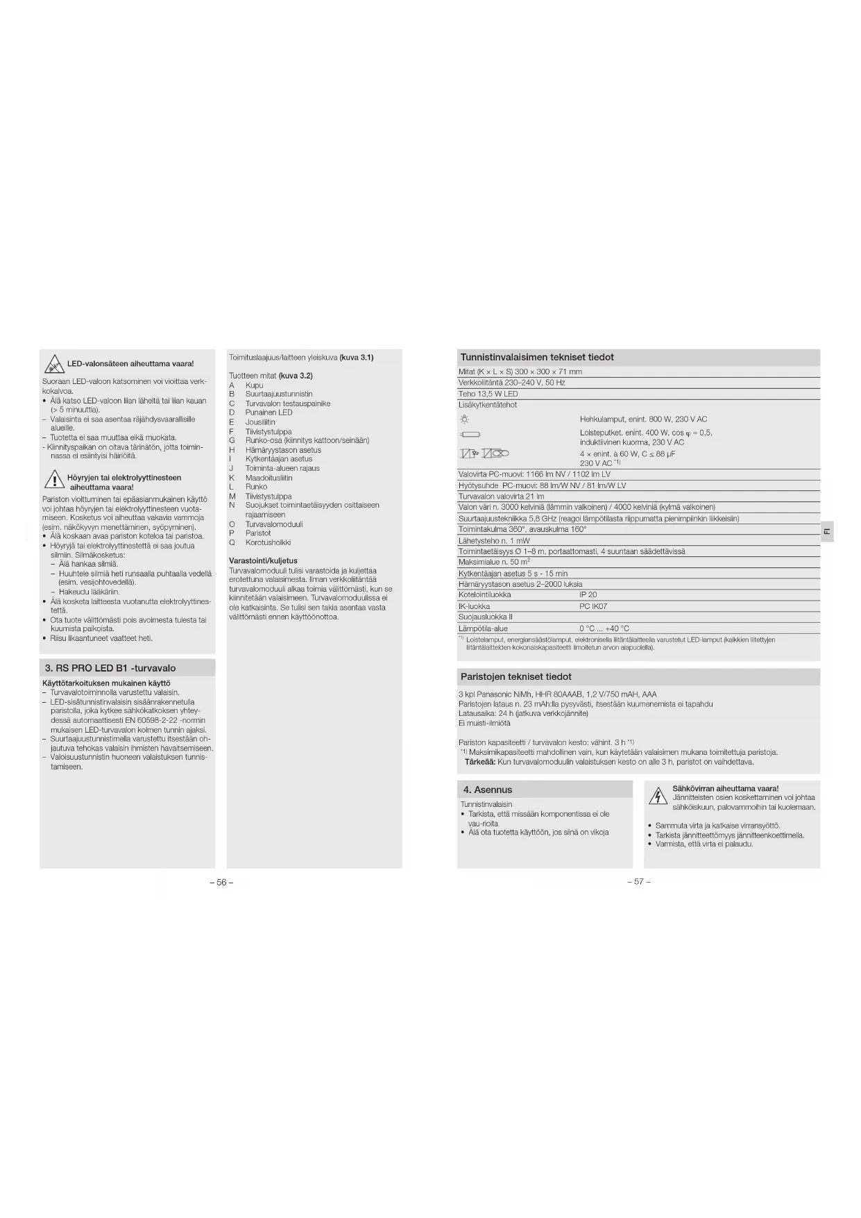 GARANTI PRODUCENT ÅRS GARANTI PRODUCENT ÅRS GARANTIFI 3 kpl Panasonic NiMh, HHR 80AAAB, 1,2 V/750 mAH, AAA Paristojen lataus n. 23 mAh:lla pysyvästi, itsestään kuumenemista ei tapahdu Latausaika: 24 h (jatkuva verkkojännite) Ei muisti-ilmiötä Pariston kapasiteetti / turvavalon kesto: vähint. 3 h *1) *1) Maksimikapasiteetti mahdollinen vain, kun käytetään valaisimen mukana toimitettuja paristoja. Tärkeää: Kun turvavalomoduulin valaistuksen kesto on alle 3 h, paristot on vaihdettava. Mitat (K×L×S) 300×300×71 mm Verkkoliitäntä 230–240 V, 50 Hz Teho 13,5 W LED Lisäkytkentätehot Hehkulamput, enint. 800 W, 230 V AC Loisteputket. enint. 400 W, cos j = 0,5, induktiivinen kuorma, 230 V AC 4×enint. à 60 W, C ≤ 88 µF 230 V AC *1) Valovirta PC-muovi: 1166 lm NV / 1102 lm LV Hyötysuhde PC-muovi: 88 lm/W NV / 81 lm/W LV Turvavalon valovirta 21 lm Valon väri n. 3000 kelviniä (lämmin valkoinen) / 4000 kelviniä (kylmä valkoinen) Suurtaajuustekniikka 5,8 GHz (reagoi lämpötilasta riippumatta pienimpiinkin liikkeisiin) Toimintakulma 360°, avauskulma 160° Lähetysteho n. 1 mW Toimintaetäisyys Ø 1–8 m, portaattomasti, 4 suuntaan säädettävissä Maksimialue n. 50 m² Kytkentäajan asetus 5 s - 15 min Hämäryystason asetus 2–2000 luksia Kotelointiluokka IP 20 IK-luokka PC IK07 Suojausluokka II Lämpötila-alue 0 °C ... +40 °C *1) Loistelamput, energiansäästölamput, elektronisella liitäntälaitteella varustetut LED-lamput (kaikkien liitettyjen liitäntälaitteiden kokonaiskapasiteetti ilmoitetun arvon alapuolella). – 56 – – 57 –