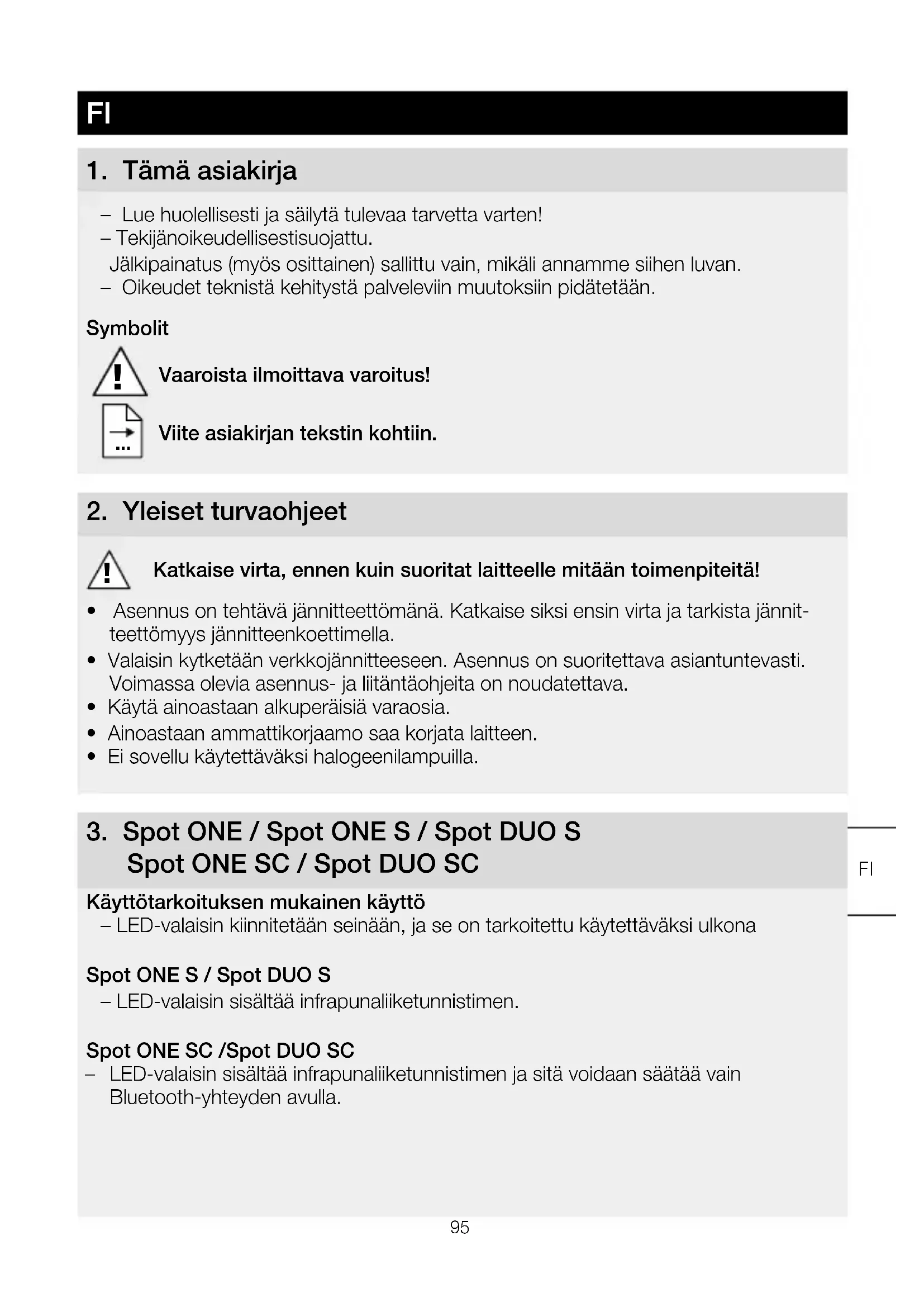 20° cd / 1000 lm 072C / 09C081C / 0C Tunnistintekniikka Spot ONE / DUO S, ONE / DUO SC: Passiivinen infrapuna Toiminta-alue: Toimintakulma Spot ONE / DUO S, ONE / DUO SC: 90° Toiminta-alue: Avauskulma Spot ONE / DUO S, ONE / DUO SC: 90° Tunnistusetäisyys Spot ONE / DUO S, ONE / DUO SC: enint. 10m Valonlähde GU10-LED-lamppu (enint. 9 W)103 Kytkentäajan asetus Spot ONE / DUO S: 8s - 35 min Spot ONE / DUO SC: 5 s - 60min Hämäryystason asetus Spot ONE / DUO S: 2 - 1000luksia Spot ONE / DUO SC: 2 - 2000 luksia Kotelointiluokka IP44 Suojausluokka I Ympäristölämpötila -20 ... +40 °C Bluetooth-taajuus Spot ONE / DUO SC: 2,4 - 2,48GHz Bluetooth-lähetysteho Spot ONE / DUO SC: 5dBm / 3mW Energiatehokkuusluokka Tuote sisältää yhden valonlähteen / kaksi valon- lähdettä, jonka/joiden energiatehokkuusluokka on ”F”.