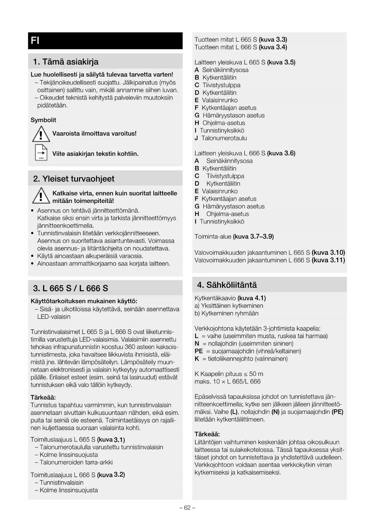 Käyttötarkoituksen mukainen käyttö: – Sisä- ja ulkotiloissa käytettävä, seinään asennettava LED-valaisin Tunnistinvalaisimet L 665 S ja L 666 S ovat liiketunnis- timilla varustettuja LED-valaisimia. Valaisimiin asennettu tehokas infrapunatunnistin koostuu 360 asteen kaksois- tunnistimesta, joka havaitsee liikkuvista ihmisistä, eläi- mistä jne. lähtevän lämpösäteilyn. Lämpösäteily muun- netaan elektronisesti ja valaisin kytkeytyy automaattisesti päälle. Erilaiset esteet (esim. seinä tai lasiruudut) estävät tunnistuksen eikä valo tällöin kytkeydy. Tärkeää: Tunnistus tapahtuu varmimmin, kun tunnistinvalaisin asennetaan sivuttain kulkusuuntaan nähden, eikä esim. puita tai seiniä ole esteenä. Toimintaetäisyys on rajalli- nen kuljettaessa suoraan valaisinta kohti. Toimituslaajuus L 665 S (kuva 3.1) – Talonumerotaululla varustettu tunnistinvalaisin – Kolme linssinsuojusta – Talonumeroiden tarra-arkki Toimituslaajuus L 666 S (kuva 3.2) – Tunnistinvalaisin – Kolme linssinsuojusta Tuotteen mitat L 665 S (kuva 3.3) Tuotteen mitat L 666 S (kuva 3.4) Laitteen yleiskuva L 665 S (kuva 3.5) A Seinäkiinnitysosa B Kytkentäliitin C Tiivistystulppa D Kytkentäliitin E Valaisinrunko F Kytkentäajan asetus G Hämäryystason asetus H Ohjelma-asetus I Tunnistinyksikkö J Talonumerotaulu Laitteen yleiskuva L 666 S (kuva 3.6) A Seinäkiinnitysosa B Kytkentäliitin C Tiivistystulppa D Kytkentäliitin E Valaisinrunko F Kytkentäajan asetus G Hämäryystason asetus H Ohjelma-asetus I Tunnistinyksikkö Toiminta-alue (kuva 3.7–3.9) Valovoimakkuuden jakaantuminen L665S (kuva3.10) Valovoimakkuuden jakaantuminen L666S (kuva3.11)