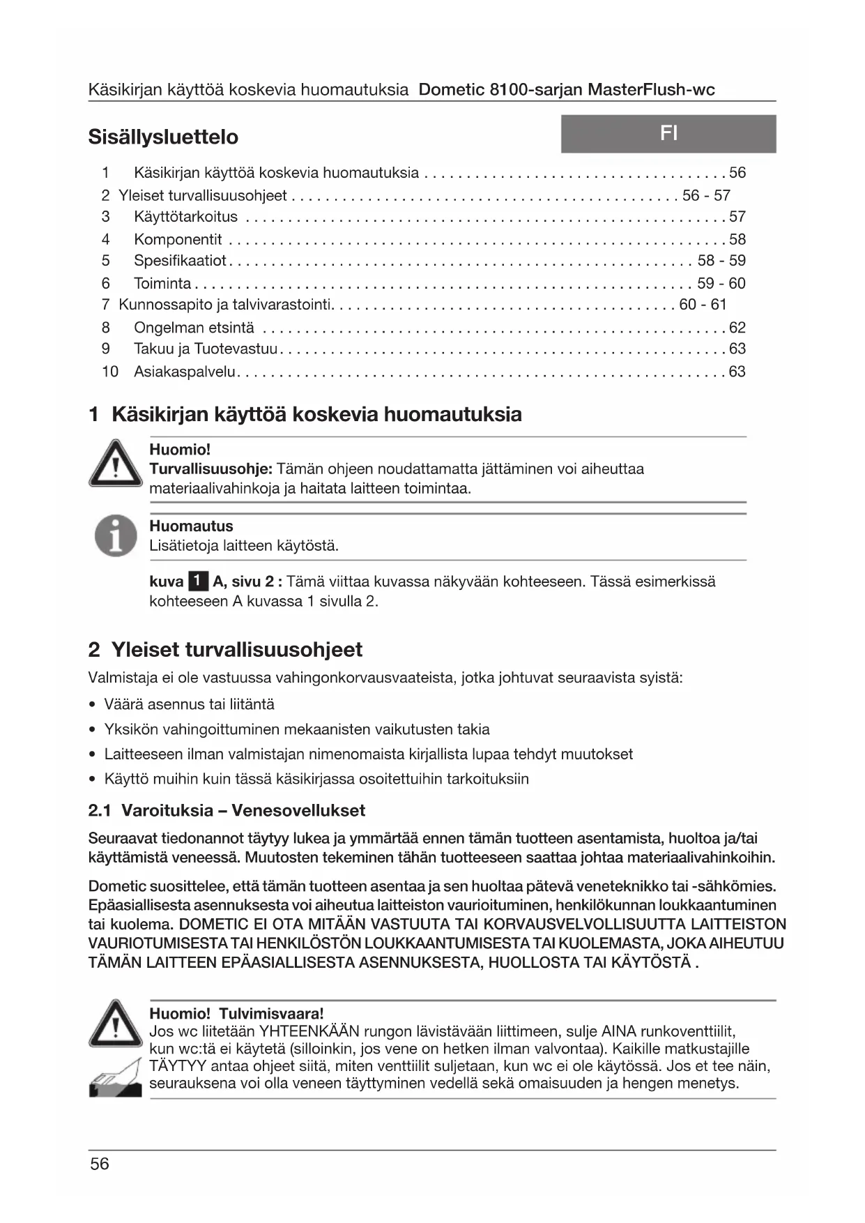 - Seuraavat tiedonannot täytyy lukea ja ymmärtää ennen tämän tuotteen asentamista, huoltoa ja/tai käyttämistä veneessä. Muutosten tekeminen tähän tuotteeseen saattaa johtaa materiaalivahinkoihin. Dometic suosittelee, että tämän tuotteen asentaa ja sen huoltaa pätevä veneteknikko tai -sähkömies. Epäasiallisesta asennuksesta voi aiheutua laitteiston vaurioituminen, henkilökunnan loukkaantuminen tai kuolema. DOMETIC EI OTA MITÄÄN VASTUUTA TAI KORVAUSVELVOLLISUUTTA LAITTEISTON VAURIOTUMISESTA TAI HENKILÖSTÖN LOUKKAANTUMISESTA TAI KUOLEMASTA, JOKA AIHEUTUU TÄMÄN LAITTEEN EPÄASIALLISESTA ASENNUKSESTA, HUOLLOSTA TAI KÄYTÖSTÄ . 1 Käsikirjan käyttöä koskevia huomautuksia p. 56