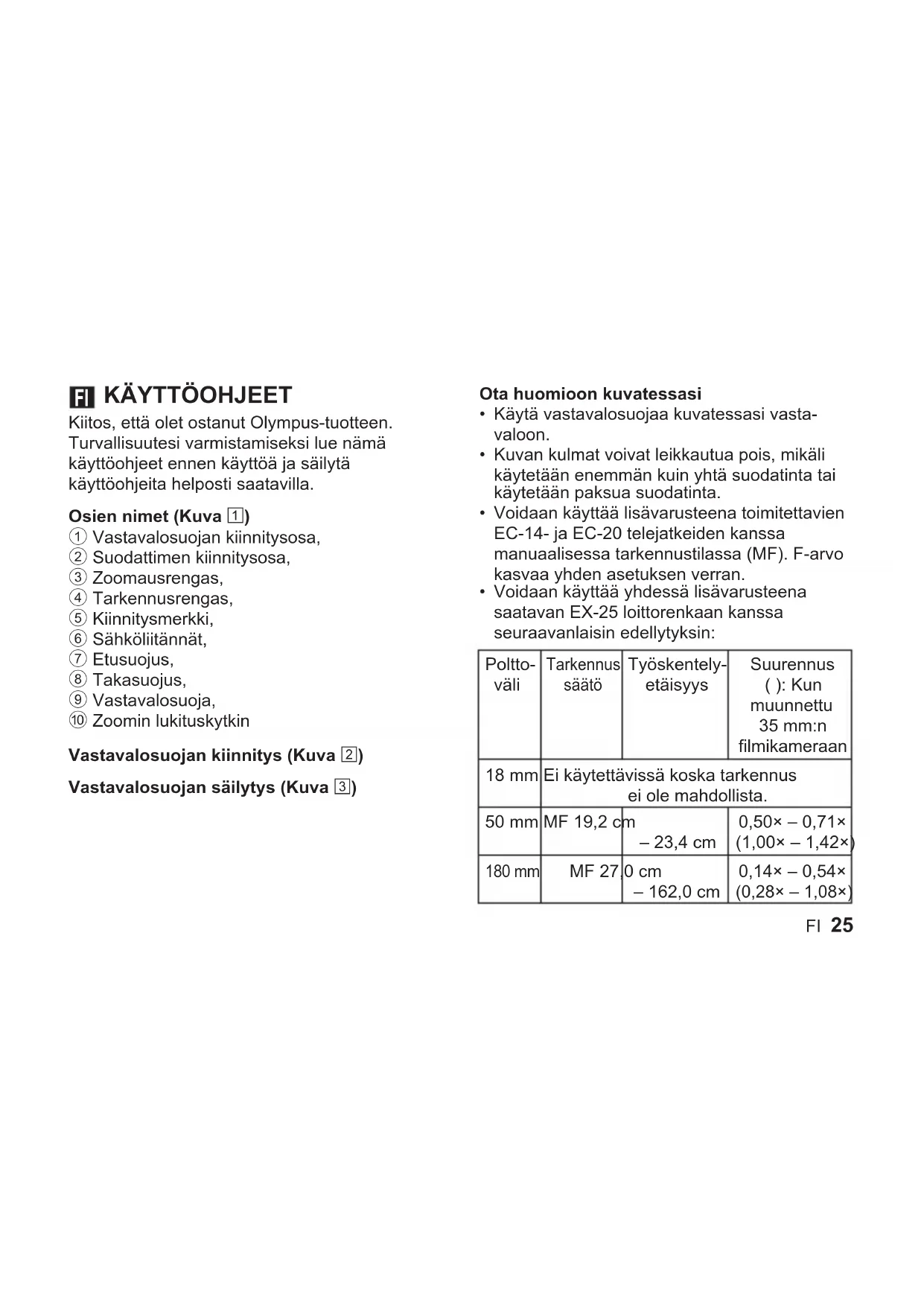 Kiitos, että olet ostanut Olympus-tuotteen. Turvallisuutesi varmistamiseksi lue nämä käyttöohjeet ennen käyttöä ja säilytä käyttöohjeita helposti saatavilla. Osien nimet (Kuva 1) 1 Vastavalosuojan kiinnitysosa, 2 Suodattimen kiinnitysosa, 3 Zoomausrengas, 4 Tarkennusrengas, 5 Kiinnitysmerkki, 6 Sähköliitännät, 7 Etusuojus, 8 Takasuojus, 9 Vastavalosuoja, 0 Zoomin lukituskytkin Vastavalosuojan kiinnitys (Kuva 2) Vastavalosuojan säilytys (Kuva 3) Ota huomioon kuvatessasi Käytä vastavalosuojaa kuvatessasi vasta- valoon. Kuvan kulmat voivat leikkautua pois, mikäli käytetään enemmän kuin yhtä suodatinta tai käytetään paksua suodatinta. Voidaan käyttää lisävarusteena toimitettavien EC-14- ja EC-20 telejatkeiden kanssa manuaalisessa tarkennustilassa (MF). F-arvo kasvaa yhden asetuksen verran. Voidaan käyttää yhdessä lisävarusteena saatavan EX-25 loittorenkaan kanssa seuraavanlaisin edellytyksin: Poltto- väli Tarkennus säätö Työskentely- etäisyys Suurennus ( ): Kun muunnettu 35 mm:n filmikameraan 18 mm Ei käytettävissä koska tarkennus ei ole mahdollista. 50 mm MF 19,2 cm – 23,4 cm 0,50× – 0,71× (1,00× – 1,42×) 180 mm MF 27,0 cm – 162,0 cm 0,14× – 0,54× (0,28× – 1,08×)
