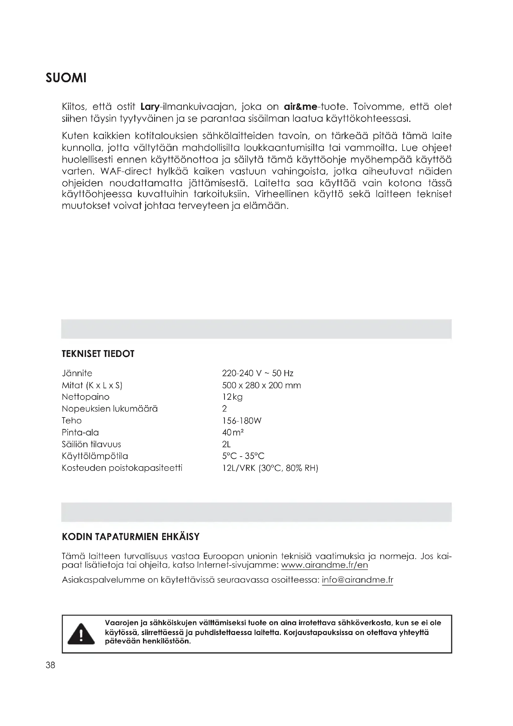 5°C - 35°C 12L/VRK (30°C, 80% RH) TEKNISET TIEDOT Tämä laitteen turvallisuus vastaa Euroopan unionin teknisiä vaatimuksia ja normeja. Jos kai- paat lisätietoja tai ohjeita, katso Internet-sivujamme: www.airandme.fr/en Asiakaspalvelumme on käytettävissä seuraavassa osoitteessa: info@airandme.fr Vaarojen ja sähköiskujen välttämiseksi tuote on aina irrotettava sähköverkosta, kun se ei ole käytössä, siirrettäessä ja puhdistettaessa laitetta. Korjaustapauksissa on otettava yhteyttä pätevään henkilöstöön.