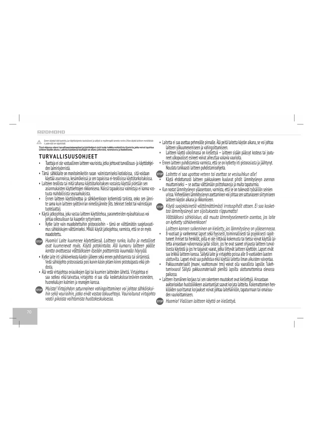 Voit peruuttaa valitun ohjelman, keskeyttää ruoanlaiton tai lämpötilan ylläpidon painamalla Cancel/Reheat-painikkeen muutaman sekunnin. Parhaan mahdollisen tuloksen saavutat, kun laitat ruokaa REDMOND RMK-M451E- monitoimikeittimen toimitukseen kuuluvan keittokirjan ruokaohjeiden mukaan. Tämä keittokirja on kehitetty kyseistä laitetta varten. Löydät nämä ruokaohjeet myös sivus- tolta www.redmond.company. Jos mielestäni tavalliset automaattiset ohjelmat eivät valmista ruokaa haluamallasi tavalla, niin käytettävissäsi on monipuolinen MULTICOOK-ohjelma, jonka avulla voit tehdä laajalti erilaisia kulinaristisia kokeita. MULTICOOK-ohjelma Tämä ohjelma mahdollistaa ruoanlaiton käyttäjän asettamien lämpötilan ja kypsen- tämisajan mukaan. MULTICOOK-ohjelman vuoksi REDMOND RMK-M451E-Monitoimi- keitin pystyy korvaamaan monet keittiökoneet ja sinä voit laittaa minkä tahansa ruoan minkä tahansa ruokaohjeen mukaan, jopa vanhasta keittokirjasta löydetyn tai Internetistä otetun ruokaohjeen mukaan. Jos ruoan kypsentämislämpötila on alle 80°С, lämpötilan ylläpito on kytketty pois päältä, eikä sitä voi kytkeä päälle käsin. MULTICOOK-ohjelmassa kypsentämisajan oletusarvo on 30 minuuttia ja lämpötilan oletusarvo on 100°С. Käyttäjä voi asettaa lämpötilan 35°С — 170°С 5 asteen välein. Käyttäjä voi asettaa kypsentämisajan 2 minuutista 15 tuntiin yhden minuutin välein. HUOM.! Turvallisuuden vuoksi kun kypsentämislämpötila on asetettu yli 130°С, niin kypsentämisaika on korkeintaan 2 tuntia. Voit laittaa MULTICOOK-ohjelmassa runsaasti erilaisia ruokia. Käytä laitteen toimituk- seen kuuluva ammattilaisten kokkien laatima keittokirja tai käyttöohjeessa oleva taulukko, jossa on lueteltu erilaisten ruokien valmistamiseen ja erilaisiin valmistusai- neisten kypsentämiseen sopivat lämpötilat. Voit myös löytää tarvitsemasi ruokaohjeet sivustolta www.redmond.company. Jos käytät MULTICOOK-ohjelmaa kiehuvaan veteen (exempelvis, keitettäessä tuotteita), älä aseta keittolämpötilaa yli 100°C. PILAF-ohjelma Tätä ohjelmaa käyttäen valmistat pilahvia. PILAF-ohjelman kypsentämisajan oletusarvo on 35 minuuttia. Voit myös asettaa ajan manuaalisesti 10 minuutista 2 tuntiin 5 minuu- tin välein. STEAM-ohjelma Tätä ohjelmaa käyttäen höyrytät lihaa, kalaa, kasviksia ja useasta raaka-aineesta koostuvia ruokia. Ohjelman kypsentämisajan oletusarvo on 30 minuuttia. Voit myös asettaa ajan manuaalisesti 10 minuutista 2 tuntiin 5 minuutin välein. Höyrytykseen on käytössä erillinen astia, joka kuuluu toimitukseen: