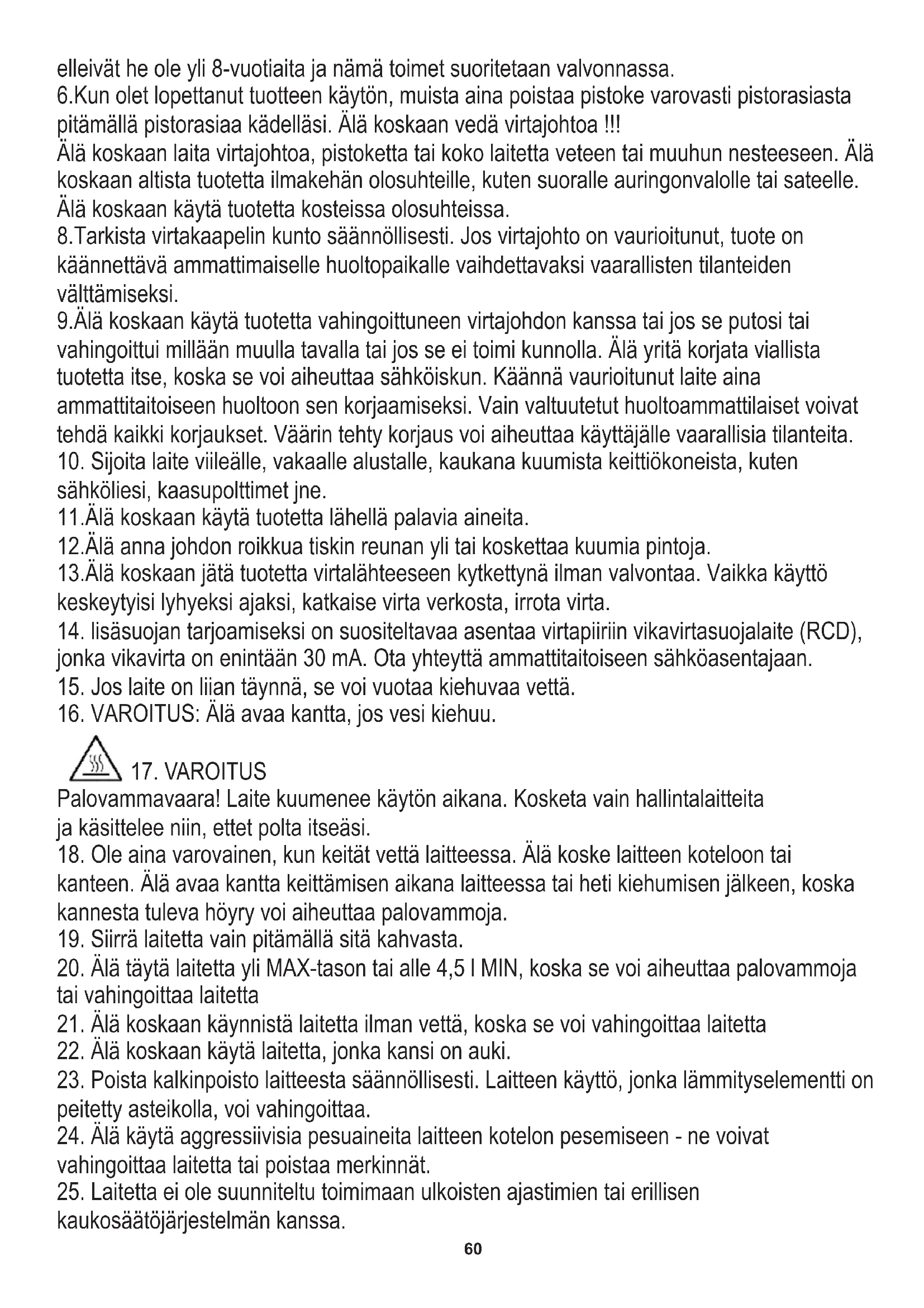 16. VAROITUS: Älä avaa kantta, jos vesi kiehuu.