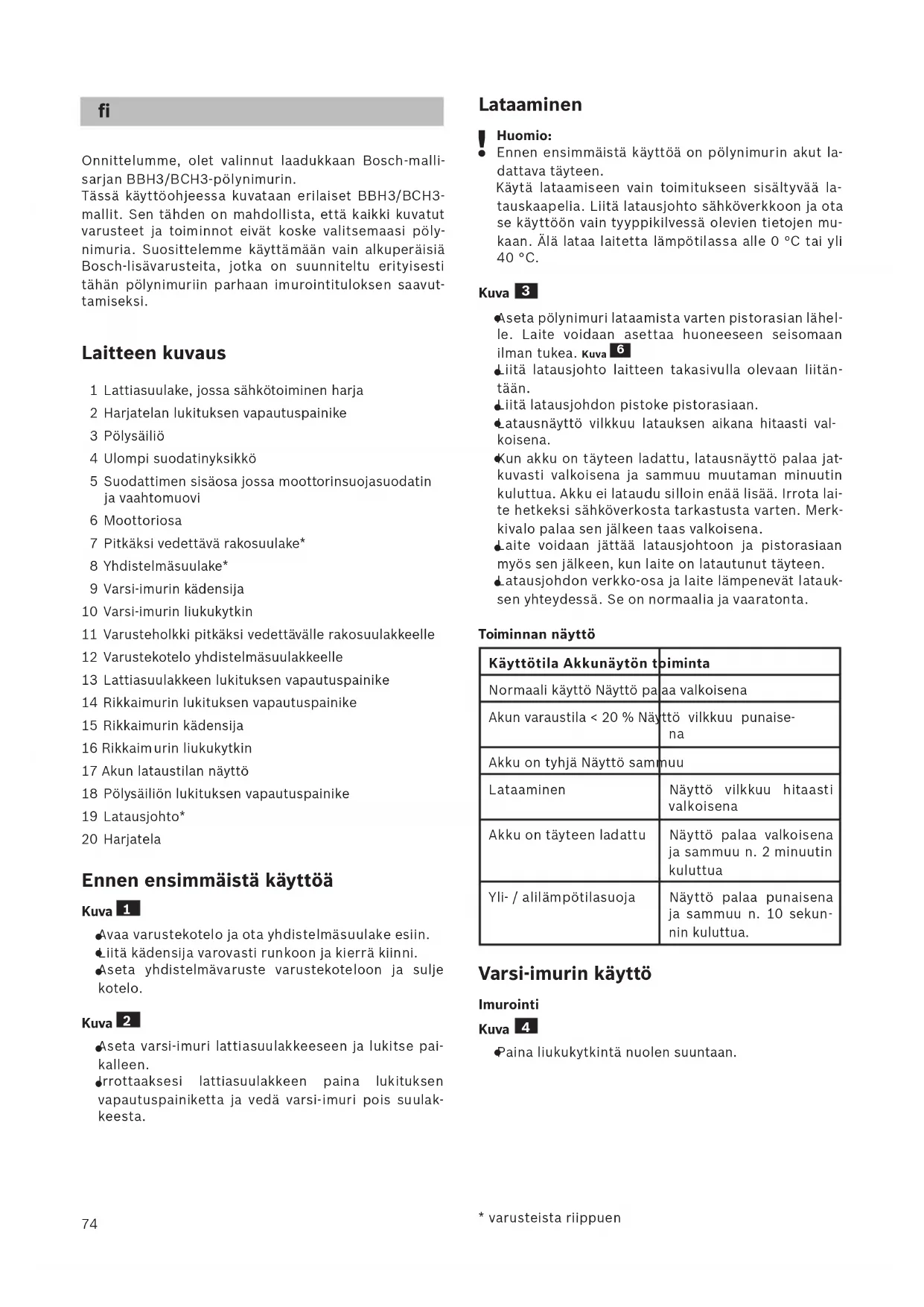 Onnittelumme, olet valinnut laadukkaan Bosch-malli- sarjan BBH3/BCH3-pölynimurin. Tässä käyttöohjeessa kuvataan erilaiset BBH3/BCH3- mallit. Sen tähden on mahdollista, että kaikki kuvatut varusteet ja toiminnot eivät koske valitsemaasi pöly- nimuria. Suosittelemme käyttämään vain alkuperäisiä Bosch-lisävarusteita, jotka on suunniteltu erityisesti tähän pölynimuriin parhaan imurointituloksen saavut- tamiseksi. Laitteen kuvaus 1 Lattiasuulake, jossa sähkötoiminen harja 2 Harjatelan lukituksen vapautuspainike 3 Pölysäiliö 4 Ulompi suodatinyksikkö 5 Suodattimen sisäosa jossa moottorinsuojasuodatin ja vaahtomuovi 6 Moottoriosa 7 Pitkäksi vedettävä rakosuulake* 8 Yhdistelmäsuulake* 9 Varsi-imurin kädensija 10 Varsi-imurin liukukytkin 11 Varusteholkki pitkäksi vedettävälle rakosuulakkeelle 12 Varustekotelo yhdistelmäsuulakkeelle 13 Lattiasuulakkeen lukituksen vapautuspainike 14 Rikkaimurin lukituksen vapautuspainike 15 Rikkaimurin kädensija 16 Rikkaim urin liukukytkin 17 Akun lataustilan näyttö 18 Pölysäiliön lukituksen vapautuspainike 19 Latausjohto* 20 Harjatela Ennen ensimmäistä käyttöä Kuva