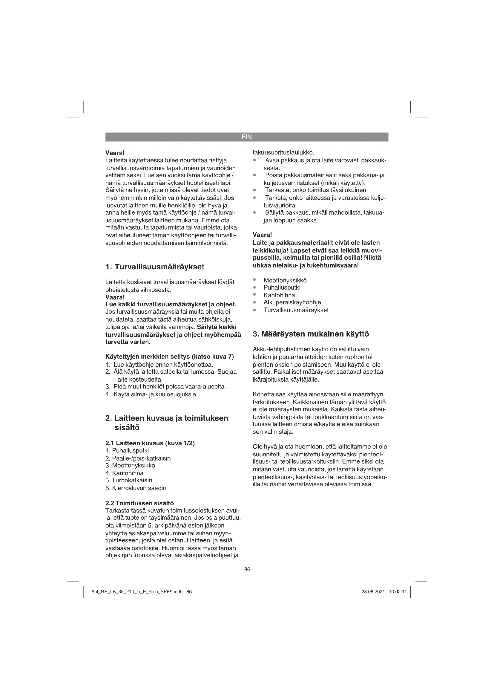 Akku-lehtipuhaltimen käyttö on sallittu vain lehtien ja puutarhajätteiden kuten ruohon tai pienten oksien poistamiseen. Muu käyttö ei ole sallittu. Paikalliset määräykset saattavat asettaa ikärajoituksia käyttäjälle. Konetta saa käyttää ainoastaan sille määrättyyn tarkoitukseen. Kaikkinainen tämän ylittävä käyttö ei ole määräysten mukaista. Kaikista tästä aiheu- tuvista vahingoista tai loukkaantumisista on vas- tuussa laitteen omistaja/käyttäjä eikä suinkaan sen valmistaja. Ole hyvä ja ota huomioon, että laitteitamme ei ole suunniteltu ja valmistettu käytettäväksi pienteol- lisuus- tai teollisuustarkoituksiin. Emme siksi ota mitään vastuuta vaurioista, jos laitetta käytetään pienteollisuus-, käsityöläis- tai teollisuustyöpaiko- illa tai näihin verrattavissa olevissa toimissa. Anl_GP_LB_36_210_Li_E_Solo_SPK9.indb 86Anl_GP_LB_36_210_Li_E_Solo_SPK9.indb 86 23.08.2021 10:02:1123.08.2021 10:02:11FIN