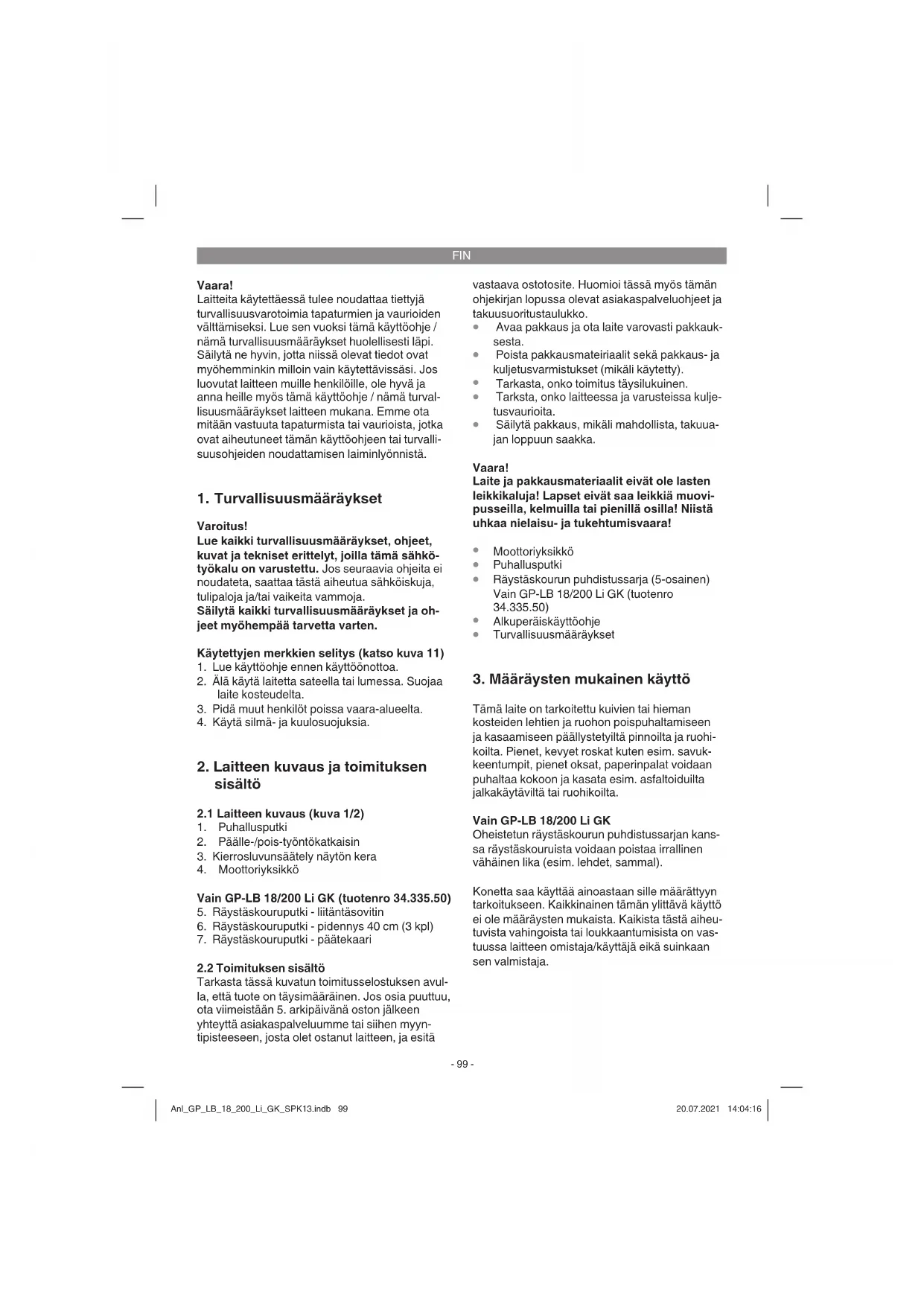 Tämä laite on tarkoitettu kuivien tai hieman kosteiden lehtien ja ruohon poispuhaltamiseen ja kasaamiseen päällystetyiltä pinnoilta ja ruohi- koilta. Pienet, kevyet roskat kuten esim. savuk- keentumpit, pienet oksat, paperinpalat voidaan puhaltaa kokoon ja kasata esim. asfaltoiduilta jalkakäytäviltä tai ruohikoilta. Vain GP-LB 18/200 Li GK Oheistetun räystäskourun puhdistussarjan kans- sa räystäskouruista voidaan poistaa irrallinen vähäinen lika (esim. lehdet, sammal). Konetta saa käyttää ainoastaan sille määrättyyn tarkoitukseen. Kaikkinainen tämän ylittävä käyttö ei ole määräysten mukaista. Kaikista tästä aiheu- tuvista vahingoista tai loukkaantumisista on vas- tuussa laitteen omistaja/käyttäjä eikä suinkaan sen valmistaja. Anl_GP_LB_18_200_Li_GK_SPK13.indb 99Anl_GP_LB_18_200_Li_GK_SPK13.indb 99 20.07.2021 14:04:1620.07.2021 14:04:16FIN