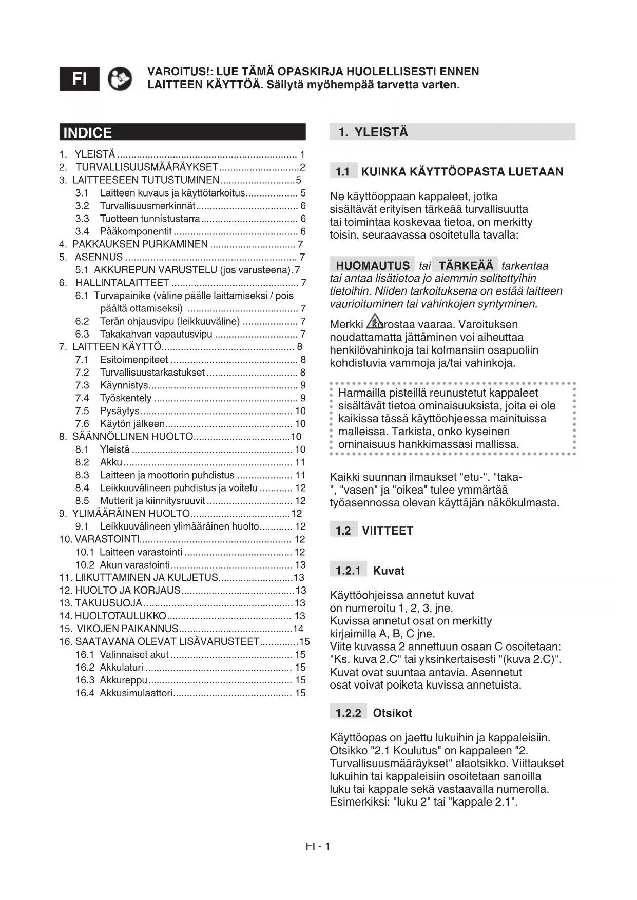 vieraaseen esineeseen. - Pysäytä laite, irrota akku ja: – tarkista vauriot – tarkista onko laitteessa löystyneitä osia ja kiristä ne – vaihda tai korjaa vaurioituneet osat vastaavilla ominaisuuksilla varustetuilla osilla.