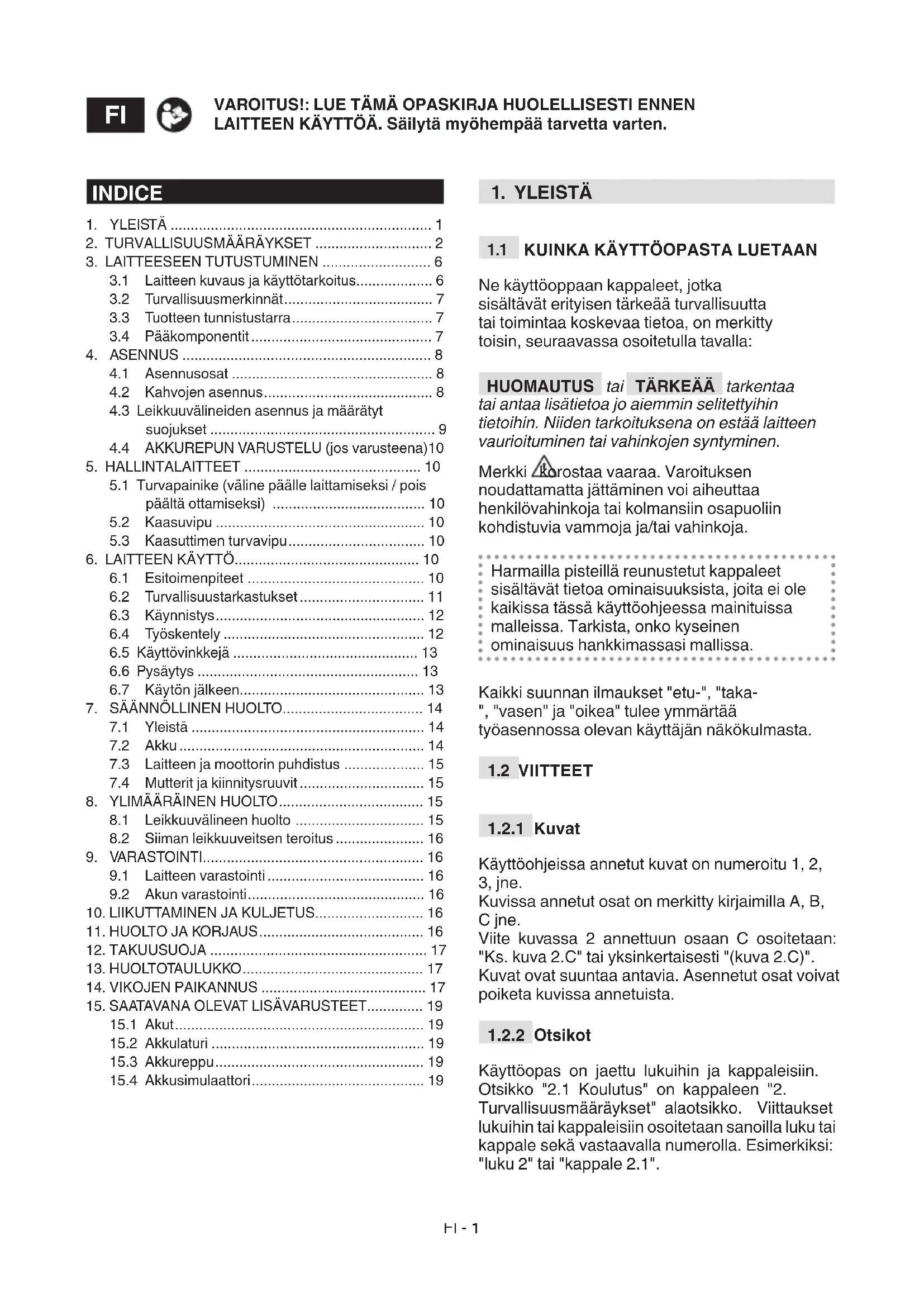 Käyttöopas on jaettu lukuihin ja kappaleisiin. Otsikko "2.1 Koulutus" on kappaleen "2. Turvallisuusmääräykset" alaotsikko. Viittaukset lukuihin tai kappaleisiin osoitetaan sanoilla luku tai kappale sekä vastaavalla numerolla. Esimerkiksi: "luku 2" tai "kappale 2.1". INDICE