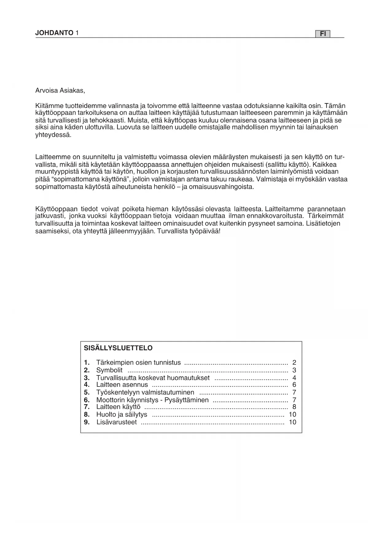 Kood Mudelil T 1.0 EJ 118801750/0 (M8 x 1,25 dx M)FI JOHDANTO 1 Arvoisa Asiakas, Kiitämme tuotteidemme valinnasta ja toivomme että laitteenne vastaa odotuksianne kaikilta osin. Tämän käyttöoppaan tarkoituksena on auttaa laitteen käyttäjää tutustumaan laitteeseen paremmin ja käyttämään sitä turvallisesti ja tehokkaasti. Muista, että käyttöopas kuuluu olennaisena osana laitteeseen ja pidä se siksi aina käden ulottuvilla. Luovuta se laitteen uudelle omistajalle mahdollisen myynnin tai lainauksen yhteydessä. Laitteemme on suunniteltu ja valmistettu voimassa olevien määräysten mukaisesti ja sen käyttö on tur- vallista, mikäli sitä käytetään käyttöoppaassa annettujen ohjeiden mukaisesti (sallittu käyttö). Kaikkea muuntyyppistä käyttöä tai käytön, huollon ja korjausten turvallisuussäännösten laiminlyömistä voidaan pitää “sopimattomana käyttönä”, jolloin valmistajan antama takuu raukeaa. Valmistaja ei myöskään vastaa sopimattomasta käytöstä aiheutuneista henkilö – ja omaisuusvahingoista. Käyttöoppaan tiedot voivat poiketa hieman käytössäsi olevasta laitteesta. Laitteitamme parannetaan jatkuvasti, jonka vuoksi käyttöoppaan tietoja voidaan muuttaa ilman ennakkovaroitusta. Tärkeimmät turvallisuutta ja toimintaa koskevat laitteen ominaisuudet ovat kuitenkin pysyneet samoina. Lisätietojen saamiseksi, ota yhteyttä jälleenmyyjään. Turvallista työpäivää! SISÄLLYSLUETTELO