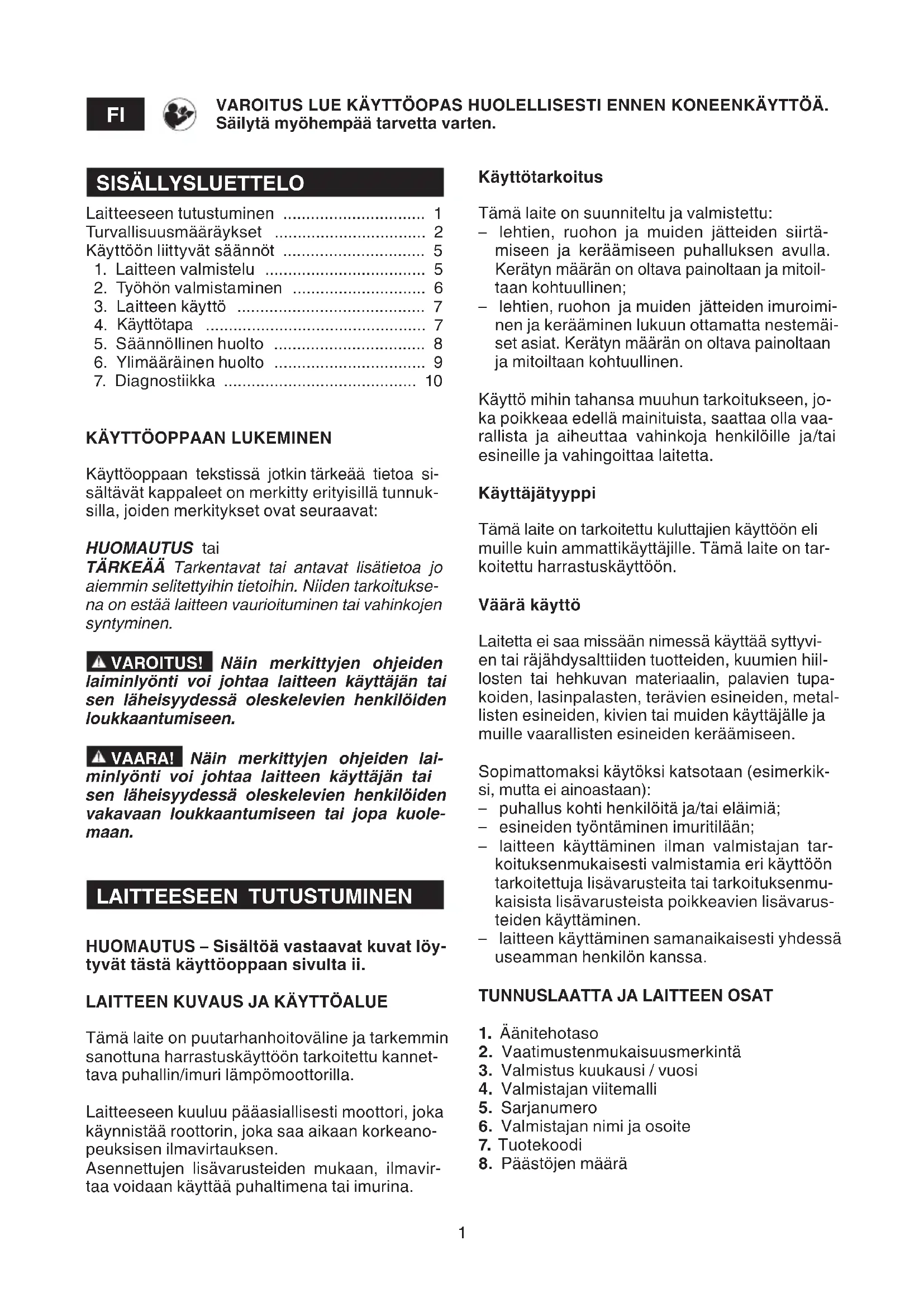 Tämä laite on puutarhanhoitoväline ja tarkemmin sanottuna harrastuskäyttöön tarkoitettu kannet- tava puhallin/imuri lämpömoottorilla. Laitteeseen kuuluu pääasiallisesti moottori, joka käynnistää roottorin, joka saa aikaan korkeano- peuksisen ilmavirtauksen. Asennettujen lisävarusteiden mukaan, ilmavir- taa voidaan käyttää puhaltimena tai imurina. Käyttötarkoitus Tämä laite on suunniteltu ja valmistettu: – lehtien, ruohon ja muiden jätteiden siirtä- miseen ja keräämiseen puhalluksen avulla. Kerätyn määrän on oltava painoltaan ja mitoil- taan kohtuullinen; – lehtien, ruohon ja muiden jätteiden imuroimi- nen ja kerääminen lukuun ottamatta nestemäi- set asiat. Kerätyn määrän on oltava painoltaan ja mitoiltaan kohtuullinen. Käyttö mihin tahansa muuhun tarkoitukseen, jo- ka poikkeaa edellä mainituista, saattaa olla vaa- rallista ja aiheuttaa vahinkoja henkilöille ja/tai esineille ja vahingoittaa laitetta. Käyttäjätyyppi Tämä laite on tarkoitettu kuluttajien käyttöön eli muille kuin ammattikäyttäjille. Tämä laite on tar- koitettu harrastuskäyttöön. Väärä käyttö Laitetta ei saa missään nimessä käyttää syttyvi- en tai räjähdysalttiiden tuotteiden, kuumien hiil- losten tai hehkuvan materiaalin, palavien tupa- koiden, lasinpalasten, terävien esineiden, metal- listen esineiden, kivien tai muiden käyttäjälle ja muille vaarallisten esineiden keräämiseen. Sopimattomaksi käytöksi katsotaan (esimerkik- si, mutta ei ainoastaan): – puhallus kohti henkilöitä ja/tai eläimiä; – esineiden työntäminen imuritilään; – laitteen käyttäminen ilman valmistajan tar- koituksenmukaisesti valmistamia eri käyttöön tarkoitettuja lisävarusteita tai tarkoituksenmu- kaisista lisävarusteista poikkeavien lisävarus- teiden käyttäminen. – laitteen käyttäminen samanaikaisesti yhdessä useamman henkilön kanssa.