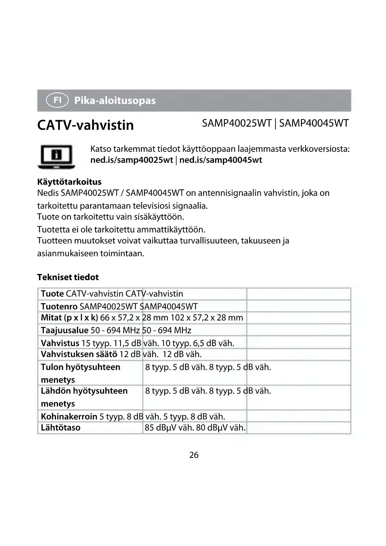 Katso tarkemmat tiedot käyttöoppaan laajemmasta verkkoversiosta: ned.is/samp40025wt | ned.is/samp40045wt Käyttötarkoitus Nedis SAMP40025WT / SAMP40045WT on antennisignaalin vahvistin, joka on tarkoitettu parantamaan televisiosi signaalia. Tuote on tarkoitettu vain sisäkäyttöön. Tuotetta ei ole tarkoitettu ammattikäyttöön. Tuotteen muutokset voivat vaikuttaa turvallisuuteen, takuuseen ja asianmukaiseen toimintaan. Tekniset tiedot Tuote CATV-vahvistin CATV-vahvistin Tuotenro SAMP40025WT SAMP40045WT Mitat (p x l x k) 66 x 57,2 x 28 mm 102 x 57,2 x 28 mm Taajuusalue 50 - 694 MHz 50 - 694 MHz Vahvistus 15 tyyp. 11,5 dB väh. 10 tyyp. 6,5 dB väh. Vahvistuksen säätö 12 dB väh. 12 dB väh. Tulon hyötysuhteen menetys 8 tyyp. 5 dB väh. 8 tyyp. 5 dB väh. Lähdön hyötysuhteen menetys 8 tyyp. 5 dB väh. 8 tyyp. 5 dB väh. Kohinakerroin 5 tyyp. 8 dB väh. 5 tyyp. 8 dB väh. Lähtötaso 85 dBµV väh. 80 dBµV väh.27 Impedanssi 75 Ω 75 Ω Tuloliitin IEC naaras x1 IEC naaras x1 Lähtöliitin IEC uros x2 IEC uros x4 Verkkovirta-adapterin tulo
