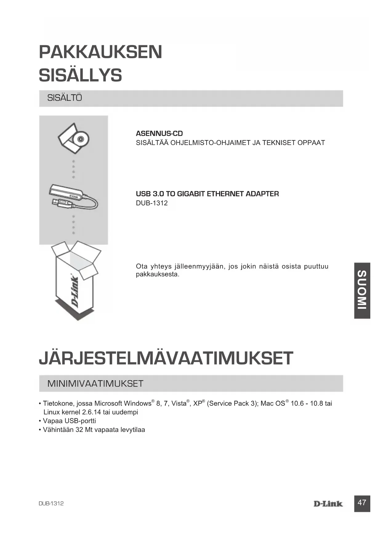 USB 3.0 TO GIGABIT EThErNET ADAPTEr DUB-1312 SISÄLTÖ Ota yhteys jälleenmyyjään, jos jokin näistä osista puuttuu pakkauksesta. MINIMIVAATIMUKSETDUB-1312