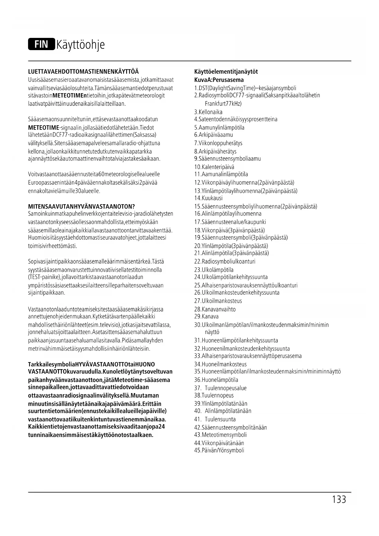 Uusi sääasemasi eroaa tavanomaisista sääasemista, jotka mittaavat vain vallitsevia sääolosuhteita. Tämän sääaseman tiedot perustuvat sitä vastoin METEOTIMEn tietoihin, jotka pätevät meteorologit laativat päivittäin uudenaikaisilla laitteillaan. Sääasema on suunniteltu niin, että se vastaanottaa koodatun METEOTIME-signaalin, jolla säätiedot lähetetään. Tiedot lähetetään DCF77-radioaikasignaalilähettimen (Saksassa) välityksellä. Siten sääasema palvelee samal la radio-ohjattuna kellona, jolla on kaikki tunnetut edut kuten vaikkapa tarkka ajannäyttö sekä automaattinen vaihto talviajasta kesäaikaan. Voit vastaanottaa sääennusteita 60 meteorologiselle alueelle Euroopassa enintään 4 päivää ennakolta sekä lisäksi 2 päivää ennakolta vielä muille 30 alueel le. MITEN SAAVUTAN HYVÄN VASTAANOTON? Samoin kuin matkapuhelinverkkojen tai televisio- ja radiolähetysten vastaanoton kyseessä ollessa on mahdol lista, ettei myöskään sääasemilla ole aina ja kaikkial la vastaanottoon tarvittavaa kenttää. Huomioi siitä syystä ehdottomasti seuraavat ohjeet, jotta laitteesi toimisi virheettömästi. Sopiva sijaintipaikka on sääasemalle äärimmäisen tärkeä. Tästä syystä sääasema on varustettu innovatiivisella testitoiminnolla (TEST-painike), jolla voit tarkistaa vastaanoton laadun ympäristössäsi asettaaksesi laitteen sille parhaiten soveltuvaan sijaintipaikkaan. Vastaanoton laadun toteamiseksi testaa sääasema käsikirjassa annettujen ohjeiden mukaan. Kytke tätä varten päälle kaikki mahdolliset häiriönlähteet (esim. televisio), jotka sijaitsevat tilassa, jonne haluat sijoittaa laitteen. Aseta sitten sääasema haluttuun paikkaan ja suuntaa se haluamallasi tavalla. Pidä samalla yhden metrin vähimmäisetäisyys mahdollisiin häiriönlähteisiin. Tarkkaile symbolia HYVÄ VASTAANOTTO tai HUONO VASTAANOTTO kuvaruudulla. Kun olet löytänyt soveltuvan paikan hyvään vastaanottoon, jätä Meteotime-sääasema sinne paikalleen, jotta vaadittavat tiedot voidaan ottaa vastaan radiosignaalin välityksellä. Muutaman minuutin sisällä näytetään aika ja päivämäärä. Erittäin suurten tietomäärien (ennuste kaikille alueille ja päiville) vastaanotto vaatii kuitenkin tuntuvasti enemmän aikaa. Kaikkien tietojen vastaanottamiseksi vaaditaan jopa 24 tunnin aika ensimmäisestä käyttöönotosta alkaen.