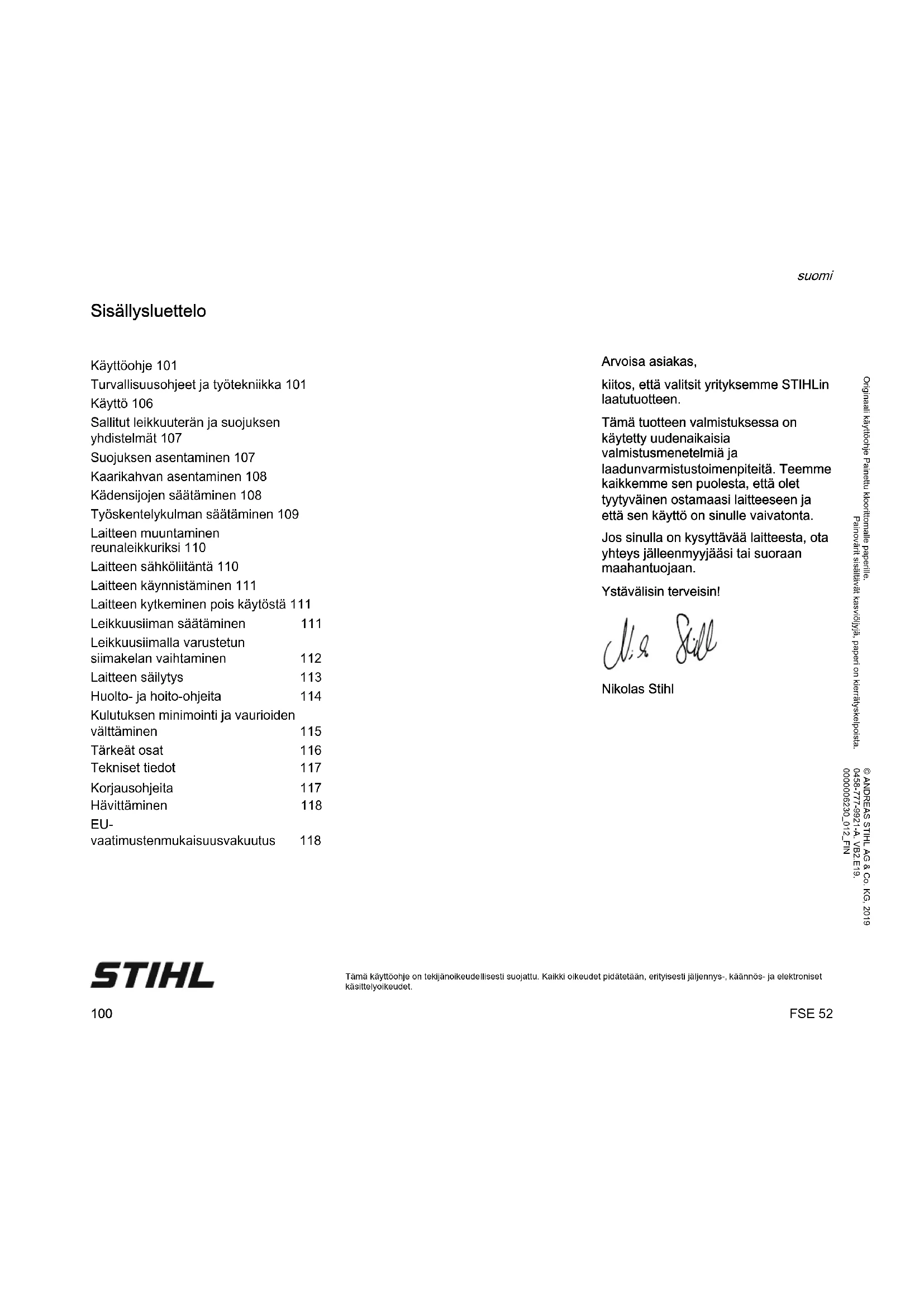 Tämä käyttöohje on tekijänoikeudellisesti suojattu. Kaikki oikeudet pidätetään, erityisesti jäljennys-, käännös- ja elektroniset käsittelyoikeudet. Sisällysluettelo Arvoisa asiakas, kiitos, että valitsit yrityksemme STIHLin laatutuotteen. Tämä tuotteen valmistuksessa on käytetty uudenaikaisia valmistusmenetelmiä ja laadunvarmistustoimenpiteitä. Teemme kaikkemme sen puolesta, että olet tyytyväinen ostamaasi laitteeseen ja että sen käyttö on sinulle vaivatonta. Jos sinulla on kysyttävää laitteesta, ota yhteys jälleenmyyjääsi tai suoraan maahantuojaan. Ystävälisin terveisin! Nikolas Stihl Käyttöohje 101 Turvallisuusohjeet ja työtekniikka 101 Käyttö 106 Sallitut leikkuuterän ja suojuksen yhdistelmät 107 Suojuksen asentaminen 107 Kaarikahvan asentaminen 108 Kädensijojen säätäminen 108 Työskentelykulman säätäminen 109 Laitteen muuntaminen reunaleikkuriksi 110 Laitteen sähköliitäntä 110 Laitteen käynnistäminen 111 Laitteen kytkeminen pois käytöstä 111 Leikkuusiiman säätäminen 111 Leikkuusiimalla varustetun siimakelan vaihtaminen 112 Laitteen säilytys 113 Huolto- ja hoito-ohjeita 114 Kulutuksen minimointi ja vaurioiden välttäminen 115 Tärkeät osat 116 Tekniset tiedot 117 Korjausohjeita 117 Hävittäminen 118 EU- vaatimustenmukaisuusvakuutus 118FSE 52 suomi