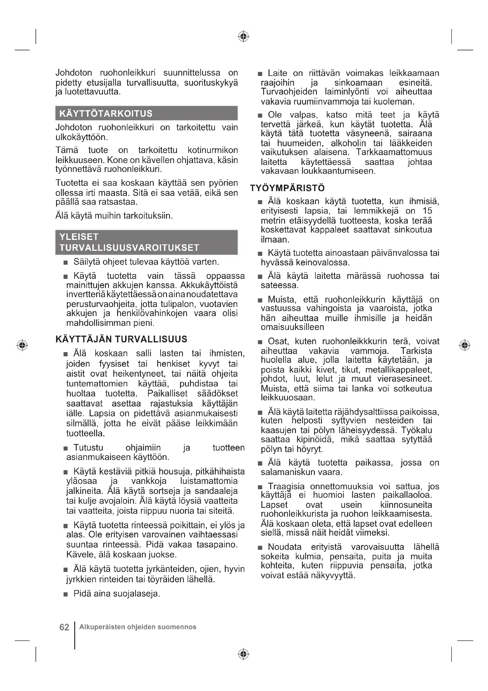hastighet för klippning av tunt gräs.62 Alkuperäisten ohjeiden suomennos Johdoton ruohonleikkuri suunnittelussa on pidetty etusijalla turvallisuutta, suorituskykyä ja luotettavuutta.