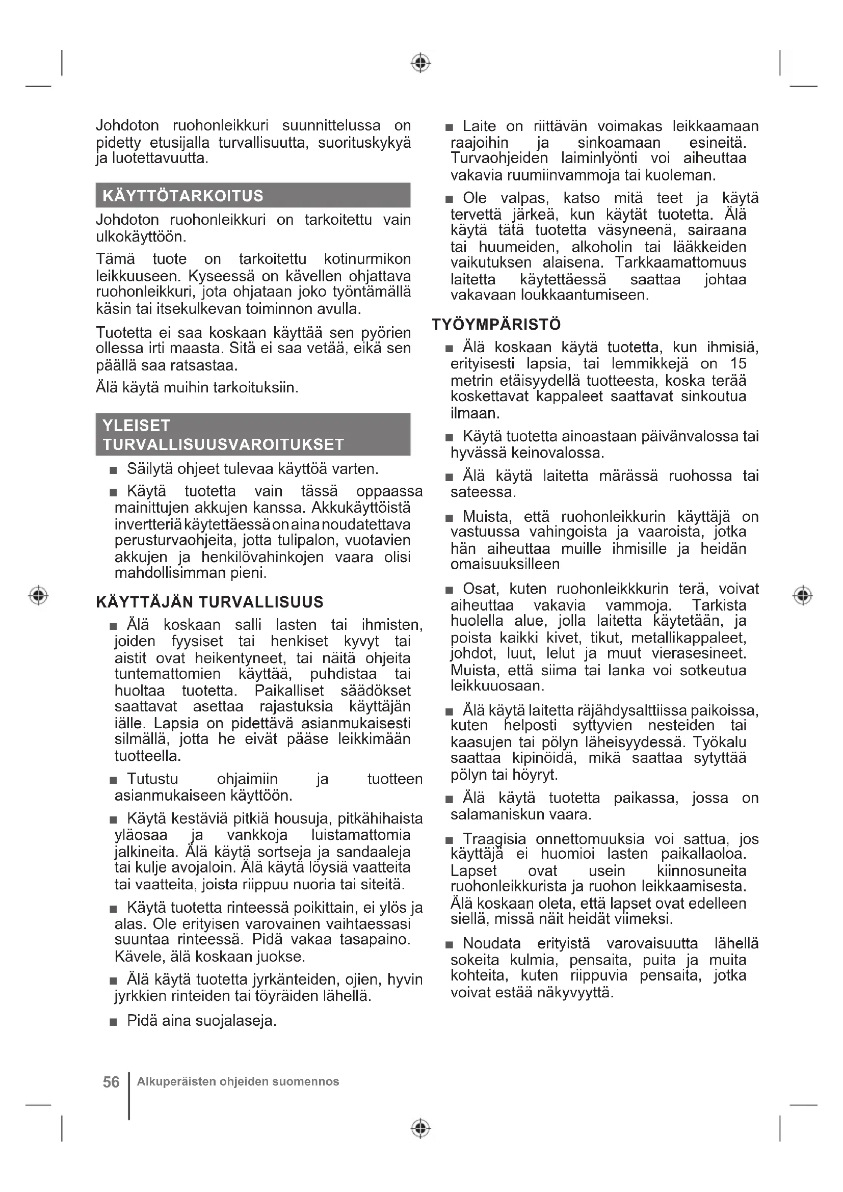 Johdoton ruohonleikkuri on tarkoitettu vain ulkokäyttöön. Tämä tuote on tarkoitettu kotinurmikon leikkuuseen. Kyseessä on kävellen ohjattava ruohonleikkuri, jota ohjataan joko työntämällä käsin tai itsekulkevan toiminnon avulla. Tuotetta ei saa koskaan käyttää sen pyörien ollessa irti maasta. Sitä ei saa vetää, eikä sen päällä saa ratsastaa. Älä käytä muihin tarkoituksiin. YLEISET TURVALLISUUSVAROITUKSET ■ Säilytä ohjeet tulevaa käyttöä varten. ■ Käytä tuotetta vain tässä oppaassa mainittujen akkujen kanssa. Akkukäyttöistä invertteriä käytettäessä on aina noudatettava perusturvaohjeita, jotta tulipalon, vuotavien akkujen ja henkilövahinkojen vaara olisi mahdollisimman pieni.