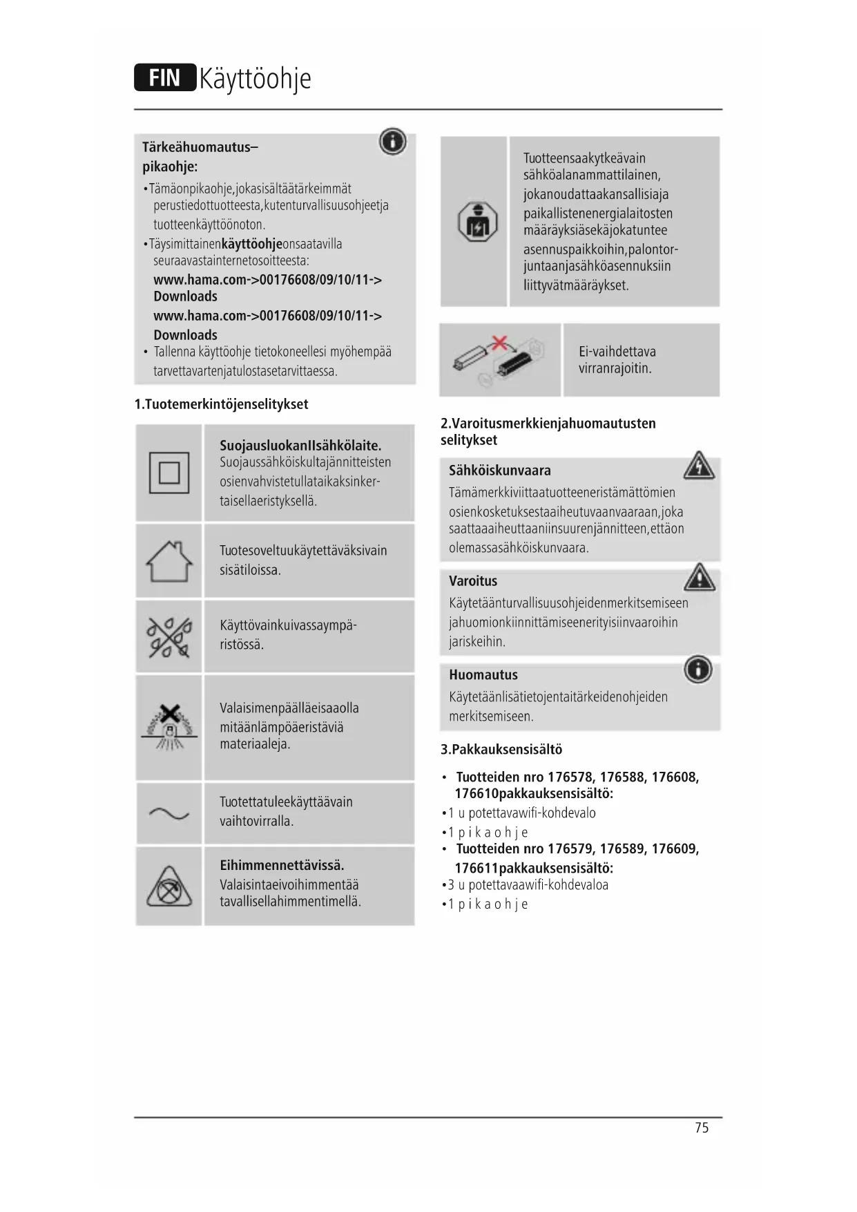 - Tuotteiden nro176578, 176588, 176608, 176610 pakkauksen sisältö: