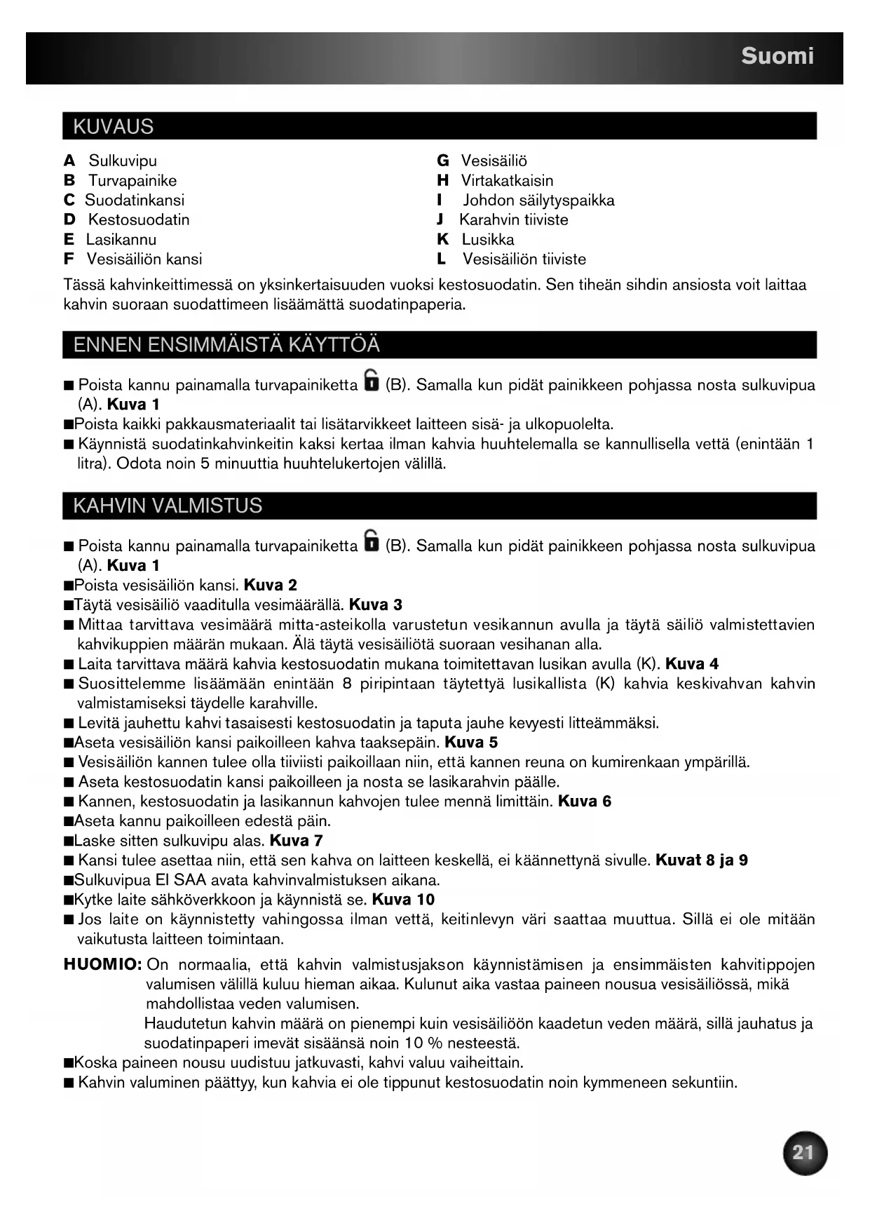 ■ Poista kannu painamalla turvapainiketta (B). Samalla kun pidät painikkeen pohjassa nosta sulkuvipua (A). Kuva 1 ■ Poista kaikki pakkausmateriaalit tai lisätarvikkeet laitteen sisä- ja ulkopuolelta. ■ Käynnistä suodatinkahvinkeitin kaksi kertaa ilman kahvia huuhtelemalla se kannullisella vettä (enintään 1 litra). Odota noin 5 minuuttia huuhtelukertojen välillä. KAHVIN VALMISTUS ■ Poista kannu painamalla turvapainiketta (B). Samalla kun pidät painikkeen pohjassa nosta sulkuvipua (A). Kuva 1 ■ Poista vesisäiliön kansi. Kuva 2 ■ Täytä vesisäiliö vaaditulla vesimäärällä. Kuva 3 ■ Mittaa tarvittava vesimäärä mitta-asteikolla varustetun vesikannun avulla ja täytä säiliö valmistettavien kahvikuppien määrän mukaan. Älä täytä vesisäiliötä suoraan vesihanan alla. ■ Laita tarvittava määrä kahvia kestosuodatin mukana toimitettavan lusikan avulla (K). Kuva 4 ■ Suosittelemme lisäämään enintään 8 piripintaan täytettyä lusikallista (K) kahvia keskivahvan kahvin valmistamiseksi täydelle karahville. ■ Levitä jauhettu kahvi tasaisesti kestosuodatin ja taputa jauhe kevyesti litteämmäksi. ■ Aseta vesisäiliön kansi paikoilleen kahva taaksepäin. Kuva 5 ■ Vesisäiliön kannen tulee olla tiiviisti paikoillaan niin, että kannen reuna on kumirenkaan ympärillä. ■ Aseta kestosuodatin kansi paikoilleen ja nosta se lasikarahvin päälle. ■ Kannen, kestosuodatin ja lasikannun kahvojen tulee mennä limittäin. Kuva 6 ■ Aseta kannu paikoilleen edestä päin. ■ Laske sitten sulkuvipu alas. Kuva 7 ■ Kansi tulee asettaa niin, että sen kahva on laitteen keskellä, ei käännettynä sivulle. Kuvat 8 ja 9 ■ Sulkuvipua EI SAA avata kahvinvalmistuksen aikana. ■ Kytke laite sähköverkkoon ja käynnistä se. Kuva 10 ■ Jos laite on käynnistetty vahingossa ilman vettä, keitinlevyn väri saattaa muuttua. Sillä ei ole mitään vaikutusta laitteen toimintaan. HUOMIO: On normaalia, että kahvin valmistusjakson käynnistämisen ja ensimmäisten kahvitippojen valumisen välillä kuluu hieman aikaa. Kulunut aika vastaa paineen nousua vesisäiliössä, mikä mahdollistaa veden valumisen. Haudutetun kahvin määrä on pienempi kuin vesisäiliöön kaadetun veden määrä, sillä jauhatus ja suodatinpaperi imevät sisäänsä noin 10 % nesteestä. ■ Koska paineen nousu uudistuu jatkuvasti, kahvi valuu vaiheittain. ■ Kahvin valuminen päättyy, kun kahvia ei ole tippunut kestosuodatin noin kymmeneen sekuntiin. A Sulkuvipu B Turvapainike C Suodatinkansi D Kestosuodatin E Lasikannu F Vesisäiliön kansi G Vesisäiliö H Virtakatkaisin I Johdon säilytyspaikka J Karahvin tiiviste K Lusikka L Vesisäiliön tiiviste Suomi