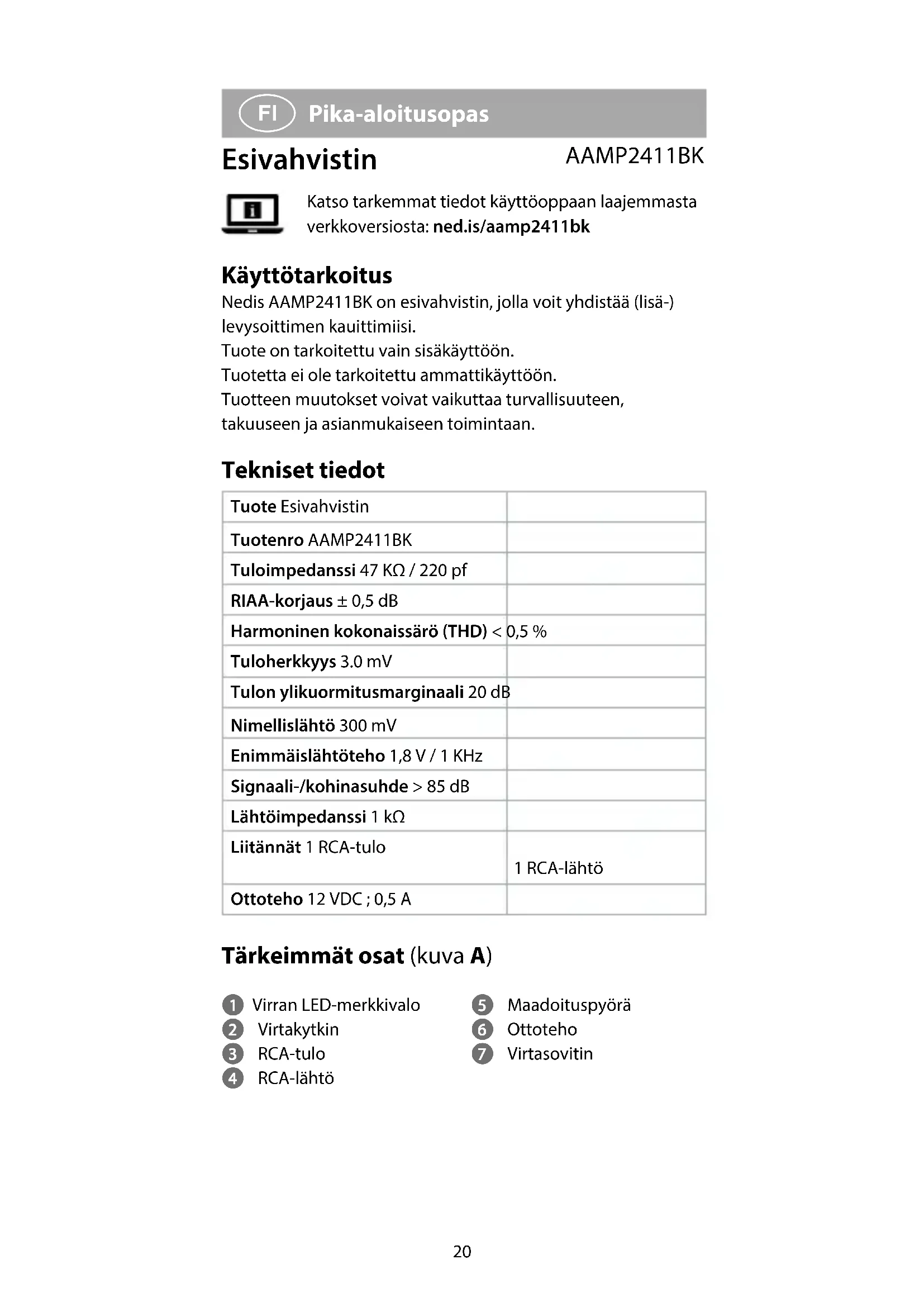Pika-aloitusopas Esivahvistin AAMP2411BK Katso tarkemmat tiedot käyttöoppaan laajemmasta verkkoversiosta: ned.is/aamp2411bk Käyttötarkoitus Nedis AAMP2411BK on esivahvistin, jolla voit yhdistää (lisä-) levysoittimen kauittimiisi. Tuote on tarkoitettu vain sisäkäyttöön. Tuotetta ei ole tarkoitettu ammattikäyttöön. Tuotteen muutokset voivat vaikuttaa turvallisuuteen, takuuseen ja asianmukaiseen toimintaan. Tekniset tiedot Tuote Esivahvistin Tuotenro AAMP2411BK Tuloimpedanssi 47 KΩ / 220 pf RIAA-korjaus ± 0,5 dB Harmoninen kokonaissärö (THD) < 0,5 % Tuloherkkyys 3.0 mV Tulon ylikuormitusmarginaali 20 dB Nimellislähtö 300 mV Enimmäislähtöteho 1,8 V / 1 KHz Signaali-/kohinasuhde > 85 dB Lähtöimpedanssi 1 kΩ Liitännät 1 RCA-tulo 1 RCA-lähtö Ottoteho 12 VDC ; 0,5 A Tärkeimmät osat (kuva A) 1 Virran LED-merkkivalo 2 Virtakytkin 3 RCA-tulo 4 RCA-lähtö 5 Maadoituspyörä 6 Ottoteho 7 Virtasovitin21 Turvallisuusohjeet