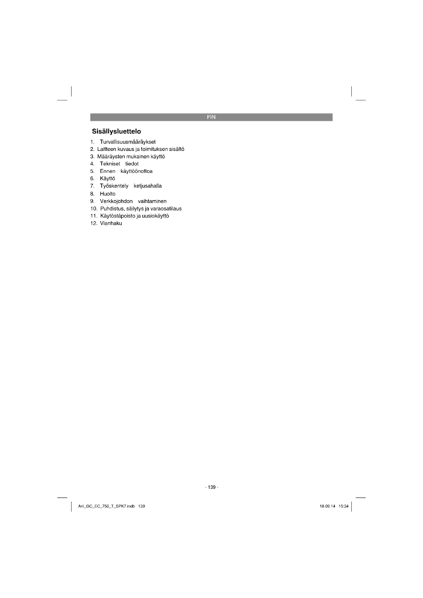 Koskee ainoastaan EU-maita Älä heitä sähkötyökaluja kotitalousjätteisiin! Euroopan direktiivin 2012/19/EY loppuunkäytetyistä sähkö- ja elektronisista laitteista ja sen kansallisek- si laiksi muuntamisen mukaan tulee käytetyt sähkötyökalut koota erikseen ja toimittaa ne ympäristöystä- välliseen kierrätykseen. Kierrätysvaihtoehto takaisinlähetykselle: Sähkölaitteen omistaja on velvoitettu laitteen palauttamisen vaihtoehtona vaikuttamaan siihen, että hänen luovuttamansa omaisuus hävitetään asianmukaisesti. Loppuun käytetty laite voidaan tätä varten luovuttaa myös keräyspisteeseen, joka suorittaa sen käytöstäpoiston kansallisten kierrätystalous- ja jätehuoltolakien tarkoittamalla tavalla. Tämä ei koske käytettyihin laitteisiin liitettyjä lisävarusteita ja apu- välineitä, joissa ei ole sähköosia. Tuotedokumentaation ja tuotteen mukana toimitettujen papereiden osittainenkin kopiointi tai muu monis- taminen on sallittu ainoastaan iSC GmbH:n nimenomaisella luvalla. Oikeus teknisiin muutoksiin pidätetään Anl_GC_EC_750_T_SPK7.indb 147Anl_GC_EC_750_T_SPK7.indb 147 18.09.14 15:3418.09.14 15:34FIN