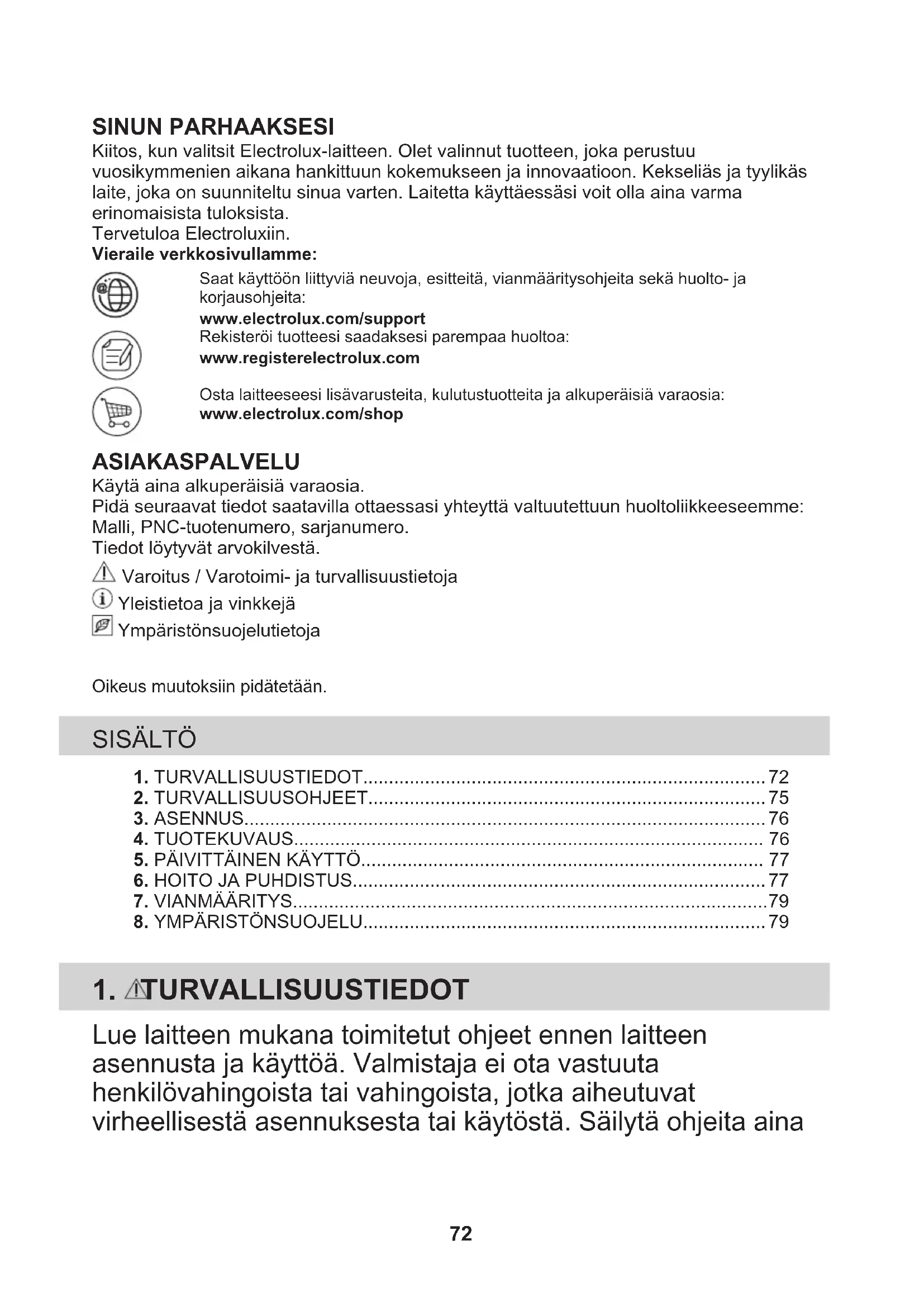 Sümboliga tähistatud materjalid võib ringlusse suunata. Selleks viige pakendid vastavatesse konteineritesse. Aidake hoida keskkonda ja inimeste tervist ja suunake elektri- ja elektroonilised jäätmed ringlusse. Ärge visake sümboliga tähistatud seadmeid muude majapidamisjäätmete hulka. Viige seade kohalikku ringluspunkti või pöörduge abi saamiseks kohalikku omavalitsusse. 71SINUN PARHAAKSESI Kiitos, kun valitsit Electrolux-laitteen. Olet valinnut tuotteen, joka perustuuvuosikymmenien aikana hankittuun kokemukseen ja innovaatioon. Kekseliäs ja tyylikäslaite, joka on suunniteltu sinua varten. Laitetta käyttäessäsi voit olla aina varmaerinomaisista tuloksista.Tervetuloa Electroluxiin.Vieraile verkkosivullamme:Saat käyttöön liittyviä neuvoja, esitteitä, vianmääritysohjeita sekä huolto- jakorjausohjeita:www.electrolux.com/supportRekisteröi tuotteesi saadaksesi parempaa huoltoa:www.registerelectrolux.comOsta laitteeseesi lisävarusteita, kulutustuotteita ja alkuperäisiä varaosia:www.electrolux.com/shop ASIAKASPALVELU Käytä aina alkuperäisiä varaosia.Pidä seuraavat tiedot saatavilla ottaessasi yhteyttä valtuutettuun huoltoliikkeeseemme:Malli, PNC-tuotenumero, sarjanumero.Tiedot löytyvät arvokilvestä. Varoitus / Varotoimi- ja turvallisuustietoja Yleistietoa ja vinkkejä YmpäristönsuojelutietojaOikeus muutoksiin pidätetään. SISÄLTÖ