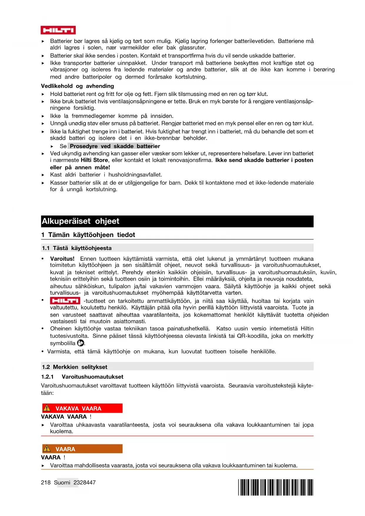 Ks. toiminta jos akku on vaurioitunut ▶ Ulosvuotavat kaasut tai nesteet saattavat vaarantaa terveyden määräystenvastaisten hävittämisen seurauksena. Hävitä akku viemällä se Hilti Store -liikkeeseen tai käänny vastuullisen jätteenkäsittely- yrityksen puoleen. Älä lähetä vaurioituneita akkuja! ▶ Älä hävitä akkuja sekajätteen mukana. ▶ Hävitä akut siten, etteivät ne voi joutua lasten käsiin. Peitä liitännät sähköä johtamattomalla materiaalilla oikosulkujen välttämiseksi. Originaalkasutusjuhend 1 Andmed kasutusjuhendi kohta