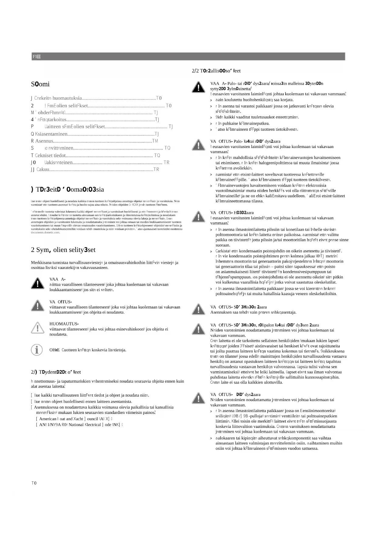 - Årsak til reklamasjonen eller beskrivelse av feilen Vær oppmerksom på at reparasjoner som utføres selv, eller som ikke utføres på en profesjonell måte, kan gå ut over sikkerheten og føre til at garantien blir ugyldig. 89FI Suomi 1 Tärkeitä huomautuksia.........................................................90 2 Symbolien selitykset........................................................... 90 3 Kohderyhmä(t)................................................................... 91 4 Käyttötarkoitus....................................................................91 5 Laitteen symbolien selitykset................................................ 91 6 Esiasentaminen...................................................................91 7 Asennus............................................................................93 8 Hävittäminen..................................................................... 96 9 Tekniset tiedot................................................................... 96 10 Lakisääteinen..................................................................... 97 11 Takuu................................................................................97 1 Tärkeitä huomautuksia Lue nämä ohjeet huolellisesti ja noudata kaikkia tämän tuotteen käyttöohjeissa annettuja ohjeita, määräyksiä ja varoituksia. Näin varmistat, että tuotteen asennus, käyttö ja huolto sujuu aina oikein. Näiden ohjeiden TÄYTYY jäädä tuotteen yhteyteen. Käyttämällä tuotetta vahvistat lukeneesi kaikki ohjeet, määräykset ja varoitukset huolellisesti ja että ymmärrät ja hyväksyt tässä annetut ehdot. Sitoudut käyttämään tuotetta ainoastaan sen käyttötarkoitukseen ja ilmoitetuissa käyttökohteissa ja noudattaen tässä tuotteen käyttöohjeessa annettuja ohjeita, määräyksiä ja varoituksia sekä voimassa olevia lakeja ja määräyksiä. Tässä annettujen ohjeiden ja varoitusten lukematta ja noudattamatta jättäminen voi johtaa omaan tai muiden loukkaantumiseen, tuotteen vaurioitumiseen tai muun ympärillä olevan omaisuuden vaurioitumiseen. Tähän tuotteen käyttöohjeeseen, ohjeisiin, määräyksiin ja varoituksiin sekä oheisdokumentteihin voidaan tehdä muutoksia ja niitä voidaan päivittää. Katso ajantasaiset tuotetiedot osoitteesta documents.dometic.com. 2 Symbolien selitykset Merkkisana tunnistaa turvallisuusviestejä ja omaisuusvahinkoihin liittyviä viestejä ja osoittaa lisäksi vaaratekijän vakavuusasteen. VAARA! Viittaa vaaralliseen tilanteeseen, joka johtaa kuolemaan tai vakavaan loukkaantumiseen, jos sitä ei vältetä. VAROITUS! viittaavat vaaralliseen tilanteeseen, joka voi johtaa kuolemaan tai vakavaan loukkaantumiseen, jos ohjeita ei noudateta. HUOMAUTUS! viittaavat tilanteeseen, joka voi johtaa esinevahinkoon, jos ohjeita ei noudateta. OHJE Tuotteen käyttöä koskevia lisätietoja.