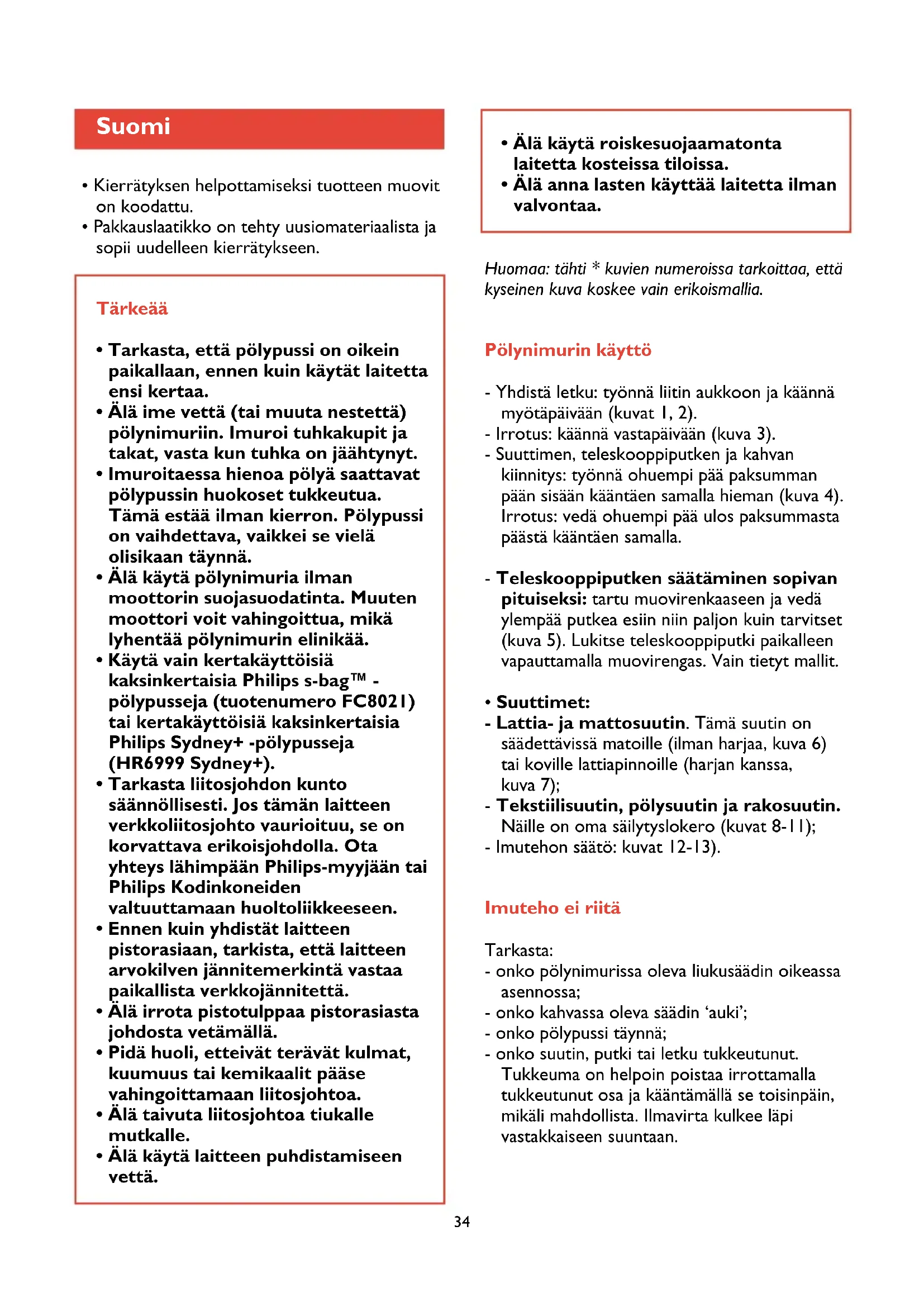 - S-class-suodatinta on saatavissa yhden kappaleen pakkauksissa tuotenumerolla HR 6992 tai tilausnumerolla 4822 480 10084. S-class-suodattimen vaihto - Avaa suodatinteline (kuva 29). - Poista vanha suodatin (kuva 30).36 - Aseta uusi S-class-suodatin näytetyllä tavalla (kuva 31). - Laita S-class-suodatiteline pölynimuriin ripa ylöspäin (kuvat 32-33). - Sulje suodatinteline ja paina ripa alas (kuva 34). Lisätarvikkeita Seuraavia Philips Mobilo Plus -pölynimurin lisätarvikkeita voit kysyä myyjältä: Turbosuutin HR 6988 Suutin puhdistaa matot tehokkaasti ja nostaa painuneen nukan takaisin pystyyn. Pyörivä harja kerää langanpätkät, hiukset, nukan ja muut vaikeasti imuroitavat hiukkaset. Turbosuutin puhdistaa syvemmältä. Parkettisuutin HR 6943 Suutin on tarkoitettu suurille parketti-, laatta-, ym. koville pinnoille. Jos pölypussien, suodattimien tai lisätarvikkeiden hankkimisessa on ongelmia, kysy neuvoa Philipsin asiakaspalvelusta. Puhelinnumero löytyy takuukortista. Philips “Turbomax”-moottori Pölynimurissa on erittäin tehokas Philips “Turbomax”-moottori. Silloin kun pölypussi on lähes tyhjä, keskiteho riittää hyvin tavalliseen imurointiin. Tämä säästää energiaa ja helpottaa imurointia. Kun pölypussi alkaa täyttyä yhä enemmän, voit valita suuremman imutehon. Näin varmistetaan, että pölypussi täyttyy kokonaan. :