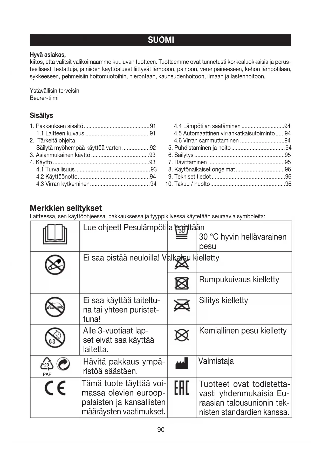Sisällys Hyvä asiakas, kiitos, että valitsit valikoimaamme kuuluvan tuotteen. Tuotteemme ovat tunnetusti korkealuokkaisia ja perus- teellisesti testattuja, ja niiden käyttöalueet liittyvät lämpöön, painoon, verenpaineeseen, kehon lämpötilaan, sykkeeseen, pehmeisiin hoitomuotoihin, hierontaan, kauneudenhoitoon, ilmaan ja lastenhoitoon. Ystävällisin terveisin Beurer-tiimi91 Suojausluokan 2 laite Hävitä laite EU:n anta- man sähkö- ja elektroniik- kalaiteromua koskevan WEEE-direktiivin (Waste Electrical and Electronic Equipment) mukaisesti. KEMA-KEUR-merkillä ilmaistaan sähköteknisen tuotteen tur- vallisuus ja yhdenmukaisuus standardien kanssa. Tässä laitteessa käytetyt tekstiilit täyttävät Oeko-Tex-stan- dardin 100 asettamat tiukat ympäristöekologiset vaatimuk- set saksalaisen Hohenstein-tutkimuslaitoksen mukaan. VAROITUS; Varoitus loukkaantumisvaarasta tai terveyttä uhkaavasta vaarasta. HUOMIO; Varoitus laitetta/varustetta koskevista mahdolli- sista vaurioista. OHJE; Huomautus tärkeistä tiedoista.