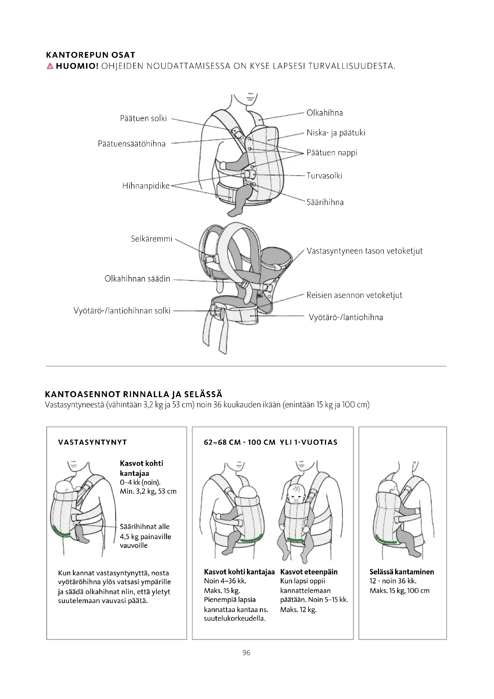 Maks. 15 kg, 100 cm Kasvot kohti kantajaa Noin 4–36 kk. Maks. 15 kg. Pienempiä lapsia kannattaa kantaa ns. suutelukorkeudella. Päätuen solki Hihnanpidike Olkahihna Niska- ja päätuki Päätuen nappi Turvasolki Säärihihna Selkäremmi Vyötärö-/lantiohihnan solki Olkahihnan säädin Reisien asennon vetoketjut Vyötärö-/lantiohihna Vastasyntyneen tason vetoketjut Päätuen säätöhihna VASTASYNTYNYT Kun kannat vastasyntynyttä, nosta vyötäröhihna ylös vatsasi ympärille ja säädä olkahihnat niin, että yletyt suutelemaan vauvasi päätä. Kasvot kohti kantajaa 0–4 kk (noin). Min. 3,2 kg, 53 cm Säärihihnat alle 4,5 kg painaville vauvoille KANTOREPUN OSAT HUOMIO! OHJEIDEN NOUDATTAMISESSA ON KYSE LAPSESI TURVALLISUUDESTA.96 97