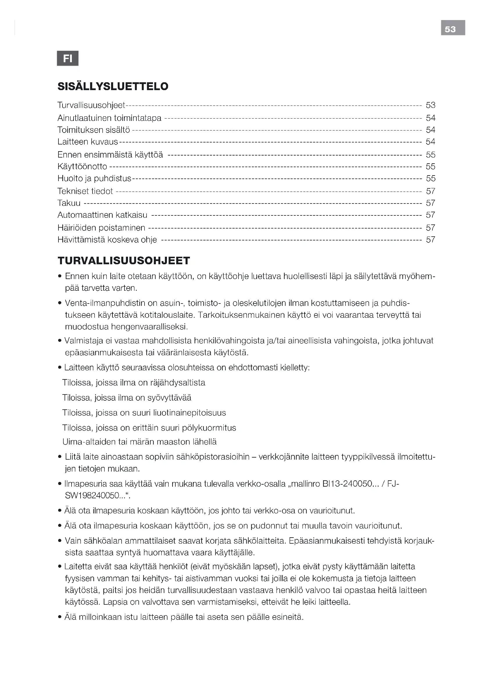 - Ilmapesuria saa käyttää vain mukana tulevalla verkko-osalla „mallinro BI13-240050... / FJ- SW198240050...“.