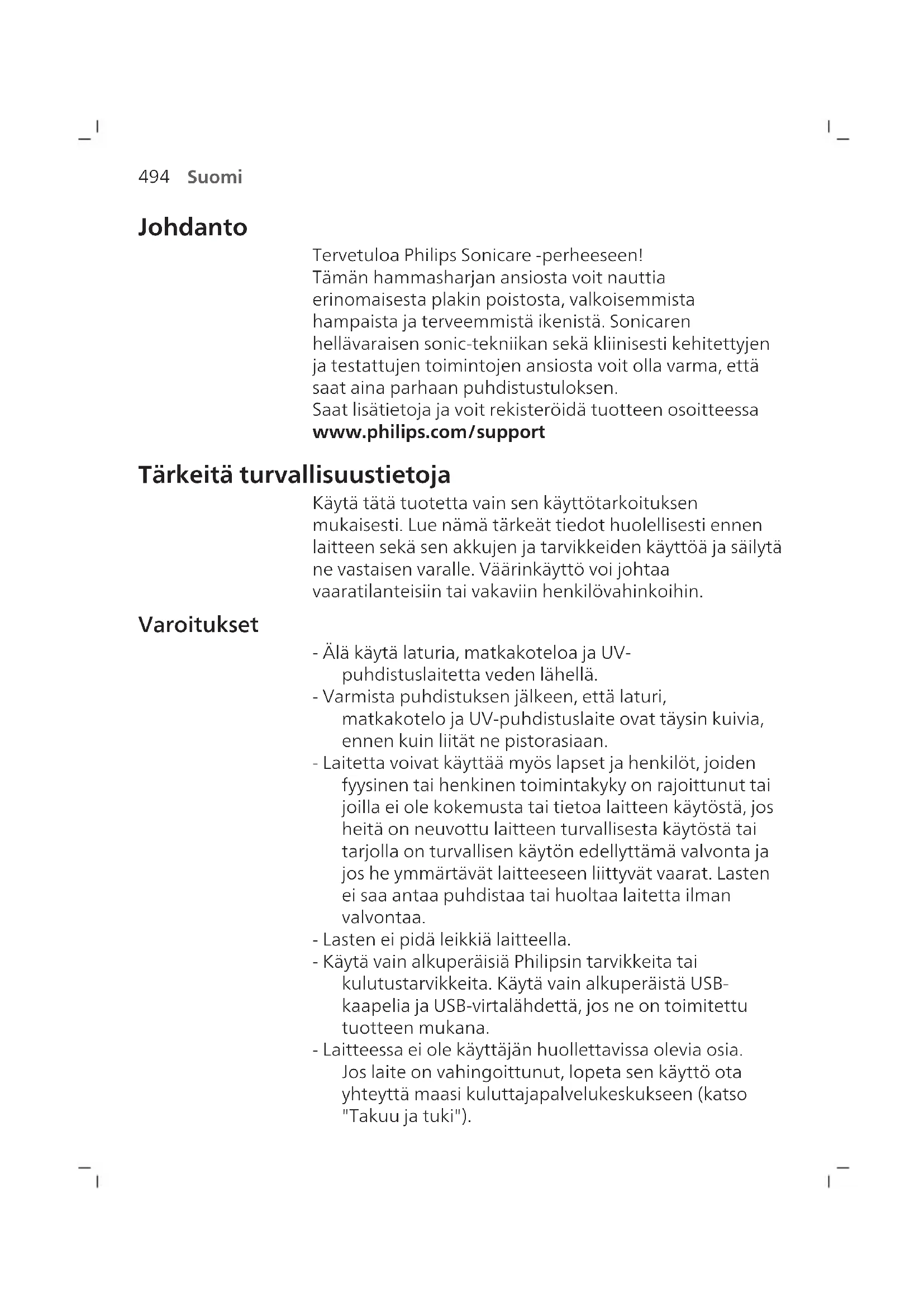 Suomi Johdanto Tervetuloa Philips Sonicare ‑perheeseen! Tämän hammasharjan ansiosta voit nauttia erinomaisesta plakin poistosta, valkoisemmista hampaista ja terveemmistä ikenistä. Sonicaren hellävaraisen sonic-tekniikan sekä kliinisesti kehitettyjen ja testattujen toimintojen ansiosta voit olla varma, että saat aina parhaan puhdistustuloksen. Saat lisätietoja ja voit rekisteröidä tuotteen osoitteessa www.philips.com/support Tärkeitä turvallisuustietoja Käytä tätä tuotetta vain sen käyttötarkoituksen mukaisesti. Lue nämä tärkeät tiedot huolellisesti ennen laitteen sekä sen akkujen ja tarvikkeiden käyttöä ja säilytä ne vastaisen varalle. Väärinkäyttö voi johtaa vaaratilanteisiin tai vakaviin henkilövahinkoihin. Varoitukset - Älä käytä laturia, matkakoteloa ja UV- puhdistuslaitetta veden lähellä. - Varmista puhdistuksen jälkeen, että laturi, matkakotelo ja UV-puhdistuslaite ovat täysin kuivia, ennen kuin liität ne pistorasiaan. - Laitetta voivat käyttää myös lapset ja henkilöt, joiden fyysinen tai henkinen toimintakyky on rajoittunut tai joilla ei ole kokemusta tai tietoa laitteen käytöstä, jos heitä on neuvottu laitteen turvallisesta käytöstä tai tarjolla on turvallisen käytön edellyttämä valvonta ja jos he ymmärtävät laitteeseen liittyvät vaarat. Lasten ei saa antaa puhdistaa tai huoltaa laitetta ilman valvontaa. - Lasten ei pidä leikkiä laitteella. - Käytä vain alkuperäisiä Philipsin tarvikkeita tai kulutustarvikkeita. Käytä vain alkuperäistä USB- kaapelia ja USB-virtalähdettä, jos ne on toimitettu tuotteen mukana. - Laitteessa ei ole käyttäjän huollettavissa olevia osia. Jos laite on vahingoittunut, lopeta sen käyttö ota yhteyttä maasi kuluttajapalvelukeskukseen (katso "Takuu ja tuki").495 Suomi - Jos USB-johto tai -virtalähde on vahingoittunut, lopeta sen käyttö. - Älä käytä laturia, matkakoteloa ja/tai UV- puhdistuslaitetta ulkona tai lämmönlähteiden lähellä. - Älä puhdista mitään tuotteen osaa astianpesukoneessa. - Laite on suunniteltu ainoastaan hampaiden, ikenien ja kielen puhdistamiseen. - Pidä UV-puhdistuslaite aina pois lasten ulottuvilta. - Lopeta UV-puhdistuslaitteen käyttö, jos UV- merkkivalo palaa, kun UV-puhdistuslaite on auki. UV- valo voi olla haitallista silmille ja iholle. - Käytä puhdistuslaitetta vain niin, että suoja on paikallaan. - Älä kosketa UV-puhdistuslaitteen kuumaa UV- lamppua. - Lopeta harjaspään käyttö, jos ilmenee katkenneita tai taipuneita harjaksia. Vaihda harjaspää 3 kuukauden välein tai useammin, jos ilmenee merkkejä kulumisesta. - Vältä suoraa kosketusta tuotteisiin, jotka sisältävät eteerisiä öljyjä tai kookosöljyä. Niiden koskettaminen voi johtaa harjasten irtoamiseen. - Enimmäiskäyttökorkeus on 4500 metriä.